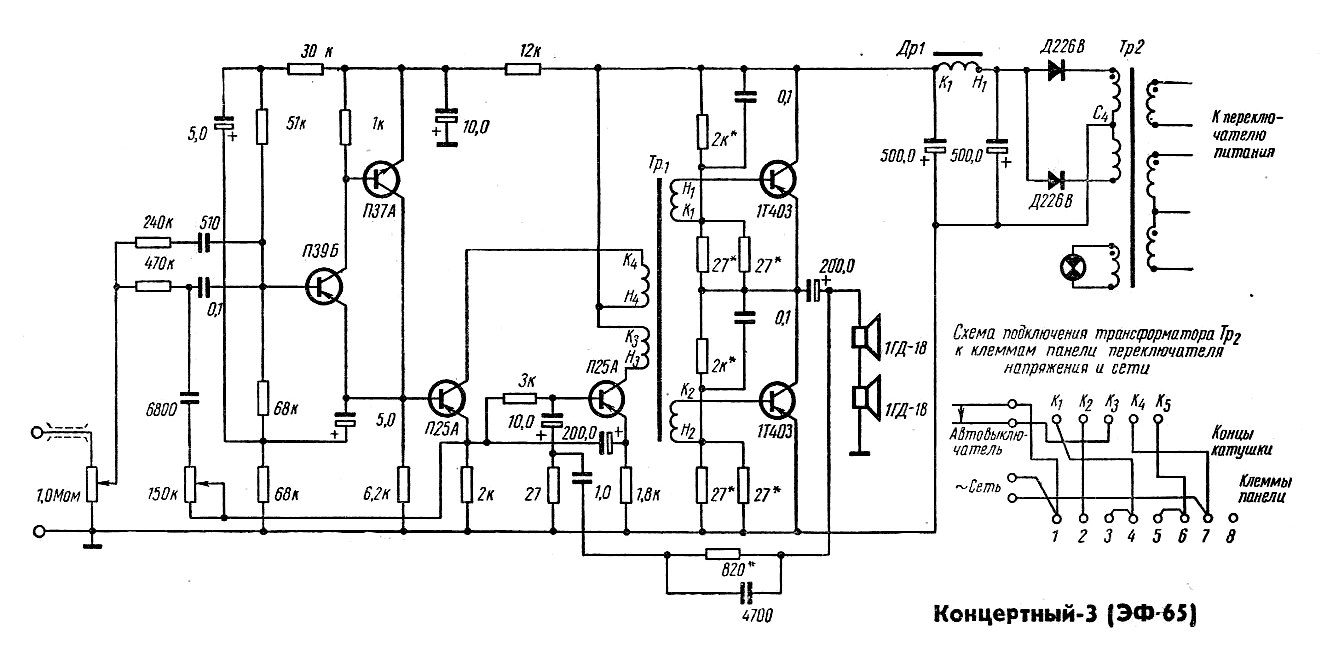 Все эти лидеры не в тему. "Концертный" - германиевый. У меня был с транзисторами П213Б на выходе. Трансформатор мелкий с очень тоненькими пластинами сердечника. Звучал приятно для того времени.