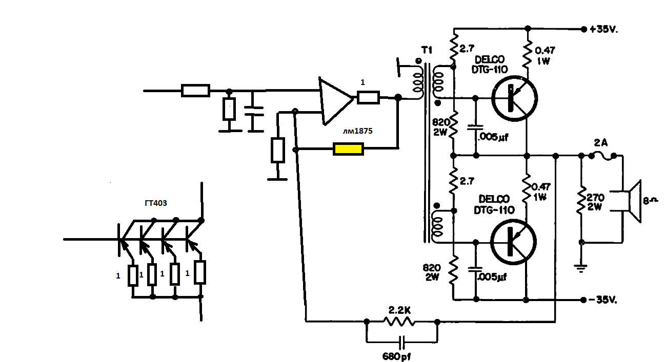 могу обьяснить-лм 1875 работает в А классе,а германцы в АВ но у них переключение плавное,поэтому результат должен быть лучше,но германцев надо хотя бы 10,,,15 кгцовых,предлагаю параллелить гт403 и трансом качать или гт806 ставитьПотому что он волшебный