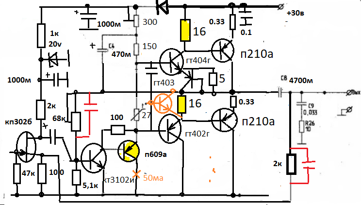 Есть интерес собрать усилитель, лампа на входе, трансформатор и 2 германиевых транзистора, п210 или п4, АВ класс с небольшим напряжением.