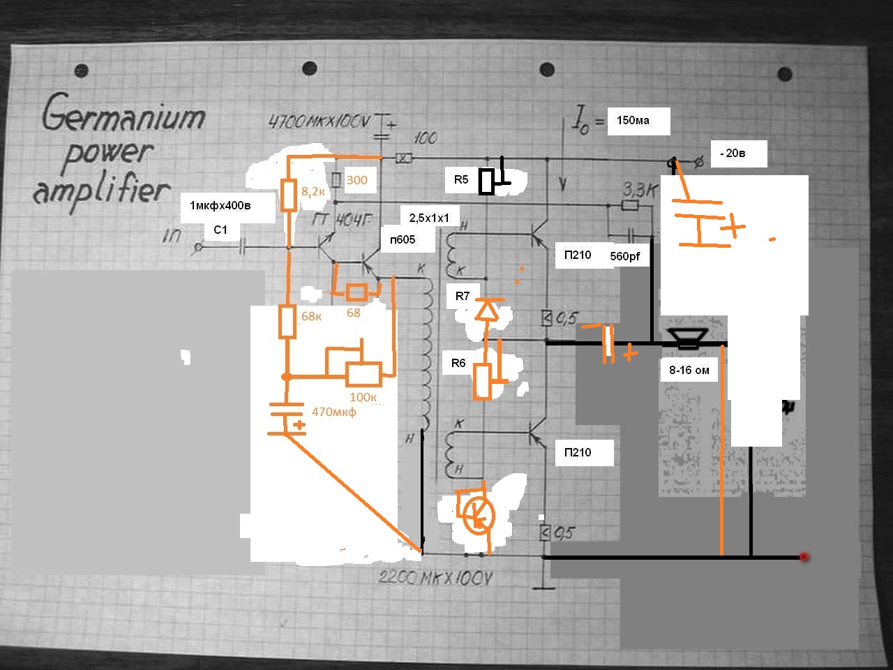 что за бред вы несете?какое подключение через 470мкф???? это фильтр,чтобы оос с эмиттера п605а на базу гт404 работала только по постоянке ,и стабилизировала режимы не влияя на усиление