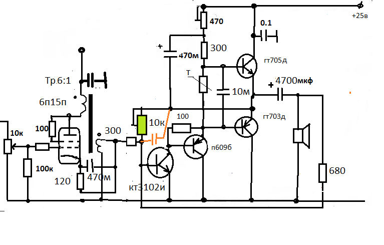 Q6 поставить п609б Q7Q8-П605 Q9Q10-гт806 Q5 оставить кремний ,диод Баксандалла выкинуть тк шиклай на кремнии открывается 0,65в а тройка п609+п605+гт806 тоже примерно 0,65в
