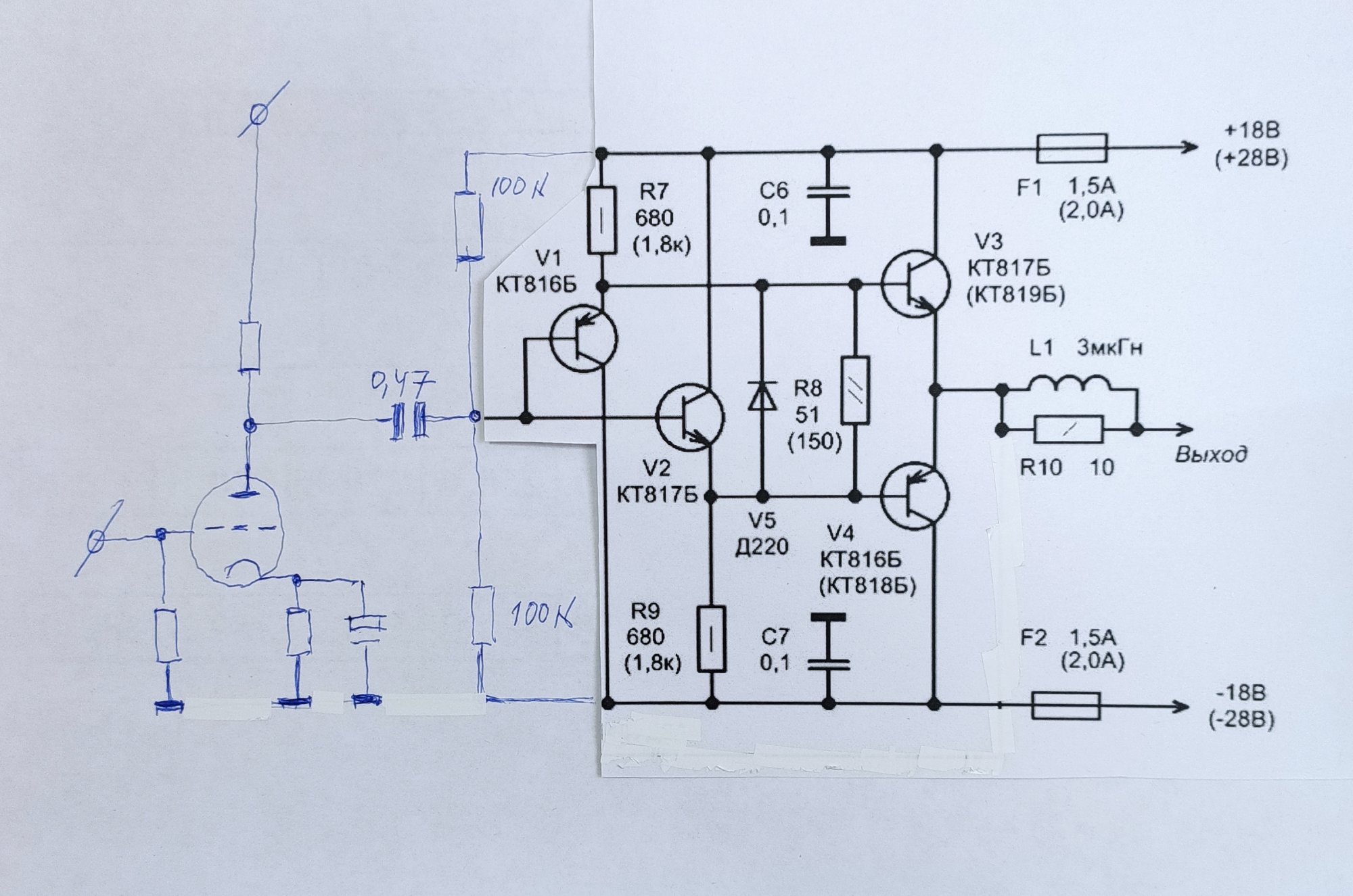 Хочется скрестить его выходной каскад с лампой. Сделать нечто подобное для двухполосного усилителя в НЧ полосу: