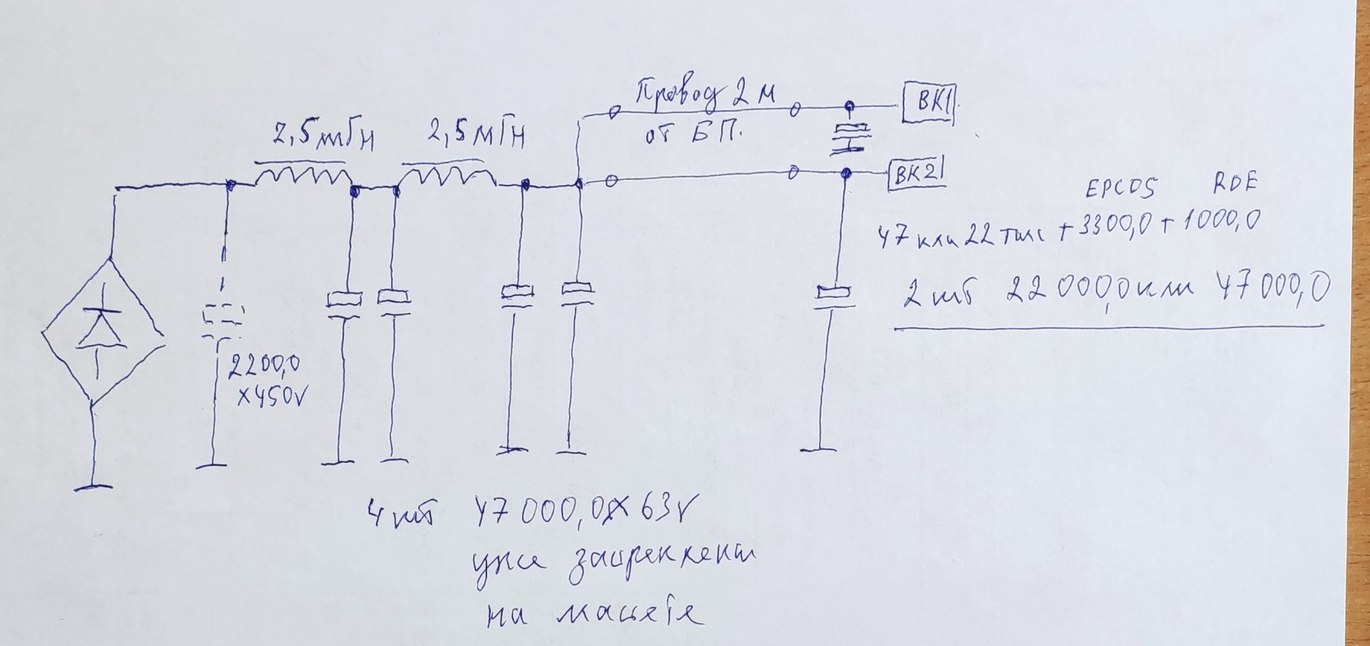 Т.е. после моста два дросселя, затем после них 2 х 47000.0 мкФ, затем провода к правому и левому каналам в усилитель?