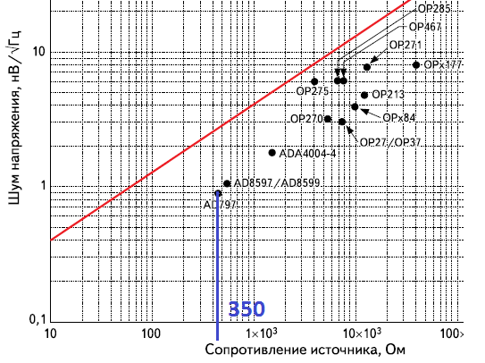 Покупал на Али, нарвался на подделку в керамическом корпусе, разломал одну микросхему, сфоткал через микроскоп кристалл, сравнил с фоткой кристалла из даташита, послал им, деньги вернули в полном объеме. Пришлось задавить жабу и купить в ЧиД, по всему прислали оригинал, не шумят вовсе, По поводу их применения в плане шумов есть хорошая статья, приведу ее еще раз. Там на рис.7 приведен пример выбора усилителей с минимальным шумом при данном сопротивлениии источника, так вот при 7,4к AD797 прекрасно подходит, наверное даже самый оптимальный вариант среди там приведенных.