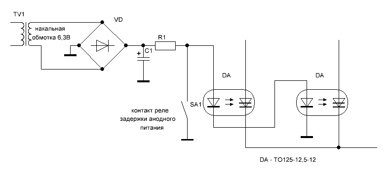 Посмотрел оптроны на 1200В дорогие и найти трудно, за то гораздо чаще попадаются промышленные тиристоры, например Т2-12, Т112-10, Т112-16, Т122-25, только нужно найти 12-й класс (на 1200В), например Т112-10-12. А так как нам не нужно регулировки мощности, то коммутация упрощается до безобразия, например от той же обмотки что питает накал кенотронов. Лучше конечно обмотку на 12В, так как напряжение срабатывания тиристора будет вызывать задержку включения и эффект от работы тиристоров может пропасть, при этом желательно в параллельно R3 и R4 включить диоды катодом к управляющему электроду. Также желательно тиристоры применять на ток 10 - 16А, так как ток удержания у них меньше 70 мА (реально меньше), это нужно чтобы тиристор сам не выключался при малом токе выпрямления.