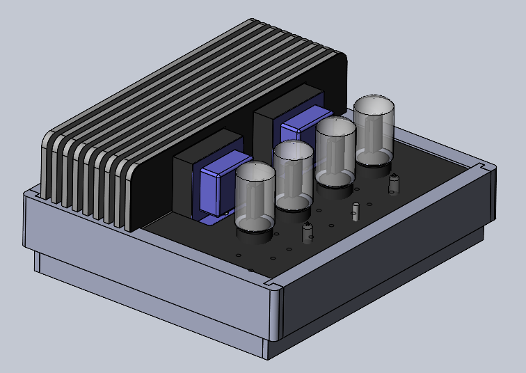 Надо наверное лампы расставить в ширину слегка. 2-1/4 визуально маловато. И чуть уширить корпус. Я старую модель взял 6п3с, надо прорисовать 12av5, они малость другие. И общие пропорции подогнать под исходный оригинал.