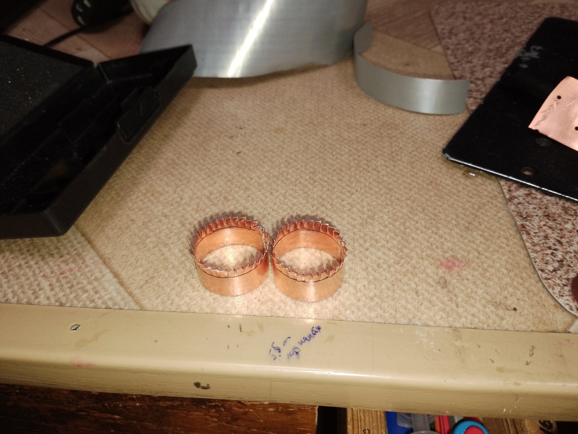 Края меди облужены и прихвачены, чтобы были немного внахлёст. Потом каркас надевался керн 25гдн-3, обмотанный фольгой до нужного диаметра, поверх металлический хомут, прогревал место пайки 100Вт паяльником и стягивал.
