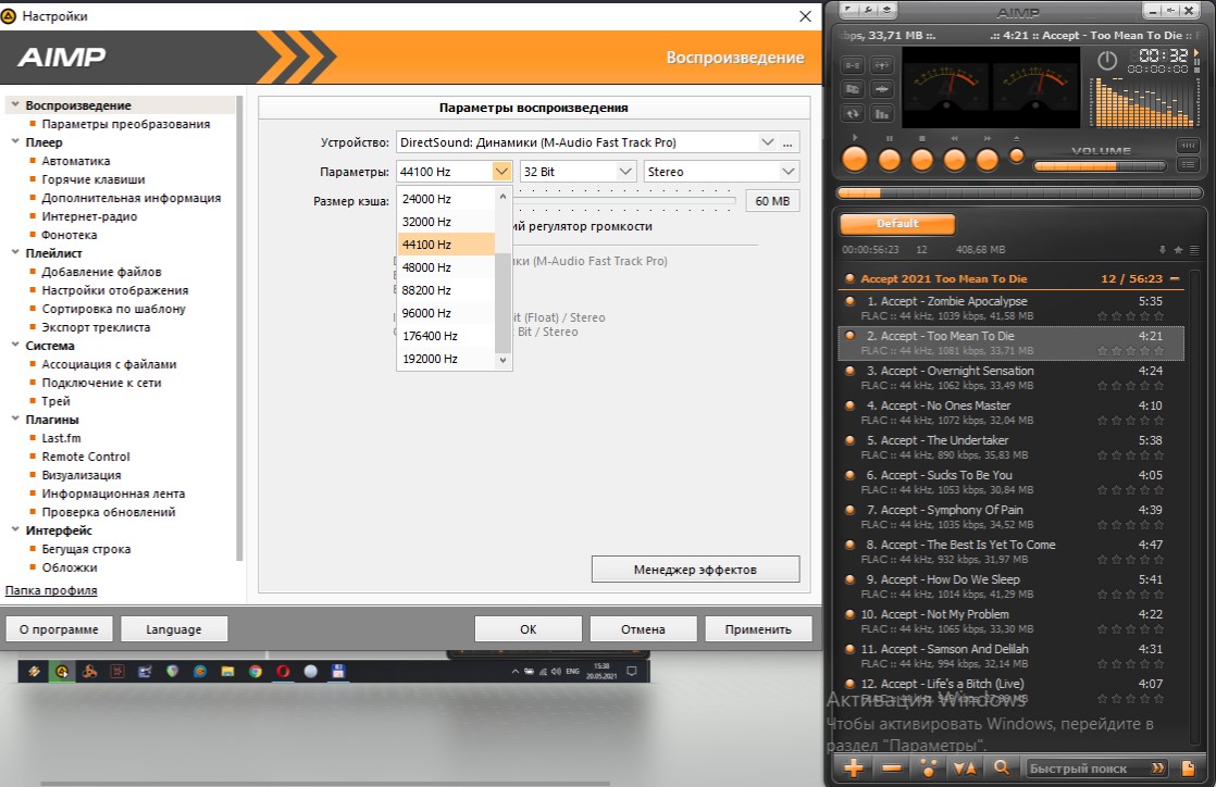 Я вот чего не понимаю: в режиме ASIO я могу лишь выбрать частоту (до 48000, хотя меня для воспроизведения вполне устраивает 44100), но не могу выбрать битность - только 32 бита, в то время как в режиме директ могу выбрать от 8 бит и выше (обычно ставлю 16), а частоту до 192000. Особой разницы между 32 и 16 не слышу, но теоретически что лучше из всех доступных режимов?AIMP.jpg