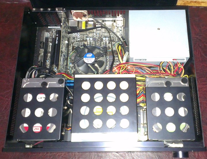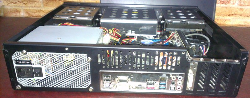 Горизонтальный системник, но на вид и по размеру как усилитель. В передней части стоят платы для читания с флешек + ручка громкости для звука. Аудиокарты не обнаружено. Да и для видео так же не особо мощная видеокарта стоит. Но 2 винчестера есть для хранения. Не забуду, спрошу у хозяина для чего это.