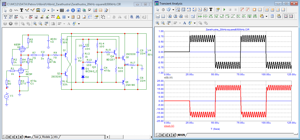 Именно поэтому я и проверяю качество работы моделей усилителей суммой сигналов: меандр 20 кГц пропущенный через ФНЧ 100 кГц и синус 1 МГц в соотношении 4:1. Тест напоминает тест DIM-100 только с другими частотами сигналов. Для проверки моделей усилителей с радиочастотным ФНЧ на входе его следует временно отключить.