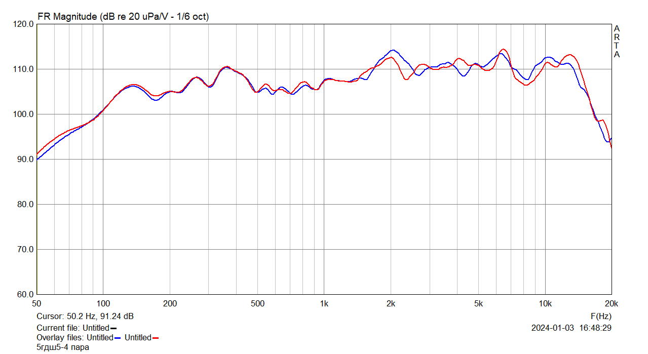 Интересно, что мой 4-омный имеет удвоение импеданса на частоте 7 кГц, а Ваш 8-омный - на частоте 9 кГц, но завал ВЧ у Вас значительно сильнее. Вы точно по оси целитесь?