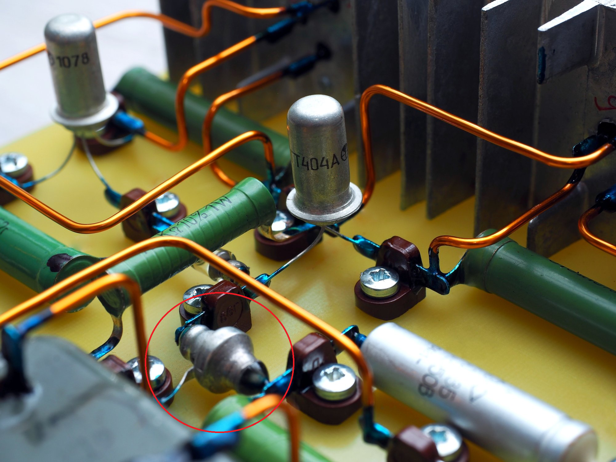 Транзистор П1 или П2, схема похожа на усилитель Лина на германии, этот похоже на входе стоит, раскачивает ГТ402 и ГТ404, а те П215 на радиаторах