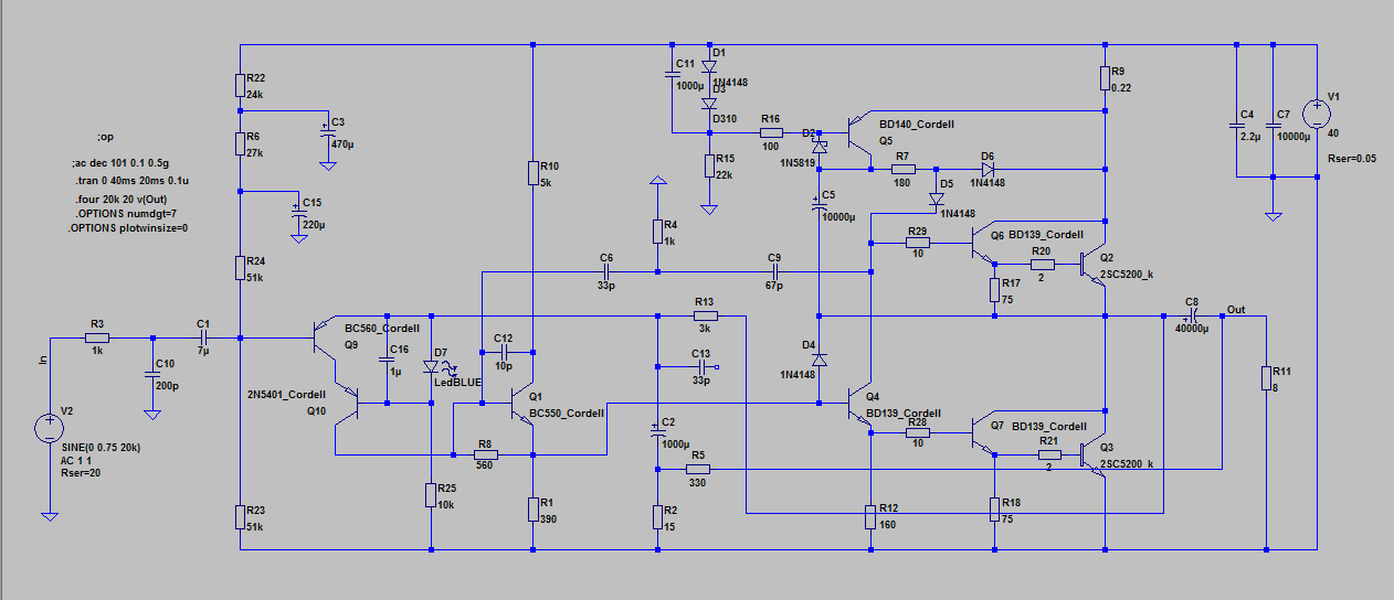 Подобная ТОС-структура (усилители с токовой ООС) встречалась очень часто в 70-е. Глупо их все называть Худами. А вот ВК у Худа оригинальный. И тот ВК, что я нарисовал, он именно Худа. Даже стабилизация тока покоя ВК тоже продолжение идей Худа. Да, ВК на дарлингтонах (что радикально улучшило качество ВК, т.к. нет мощных транзисторов с бэтой 10000), но это стало возможным именно из-за охвата ВК местной токовой ООС, которая без всяких термодатчиков поддерживает заданный токовый режим ВК. Что касается входного каскада... ну не знал Худ, что в неинвертирующем усилителе входной каскад должен быть со следящим питанием... бывает. Но мы-то теперь знаем! Так-что логично, что на входе следящий каскод. Далее буфер на ЭП (эмиттерном повторителе) - он там тоже не для красоты (минимизирует паразитную ёмкость цепей коррекции и служит динамической нагрузкой входного каскада). Глубина ООС во всём звуковом диапазоне 69db, первый полюс за пределами звукового диапазона (всё как любят аудиофилы). Ну вот как-то так. Да, конечно, реальный экземпляр с соответствующими осциллограммами был бы приятным дополнением, но... всё впереди.