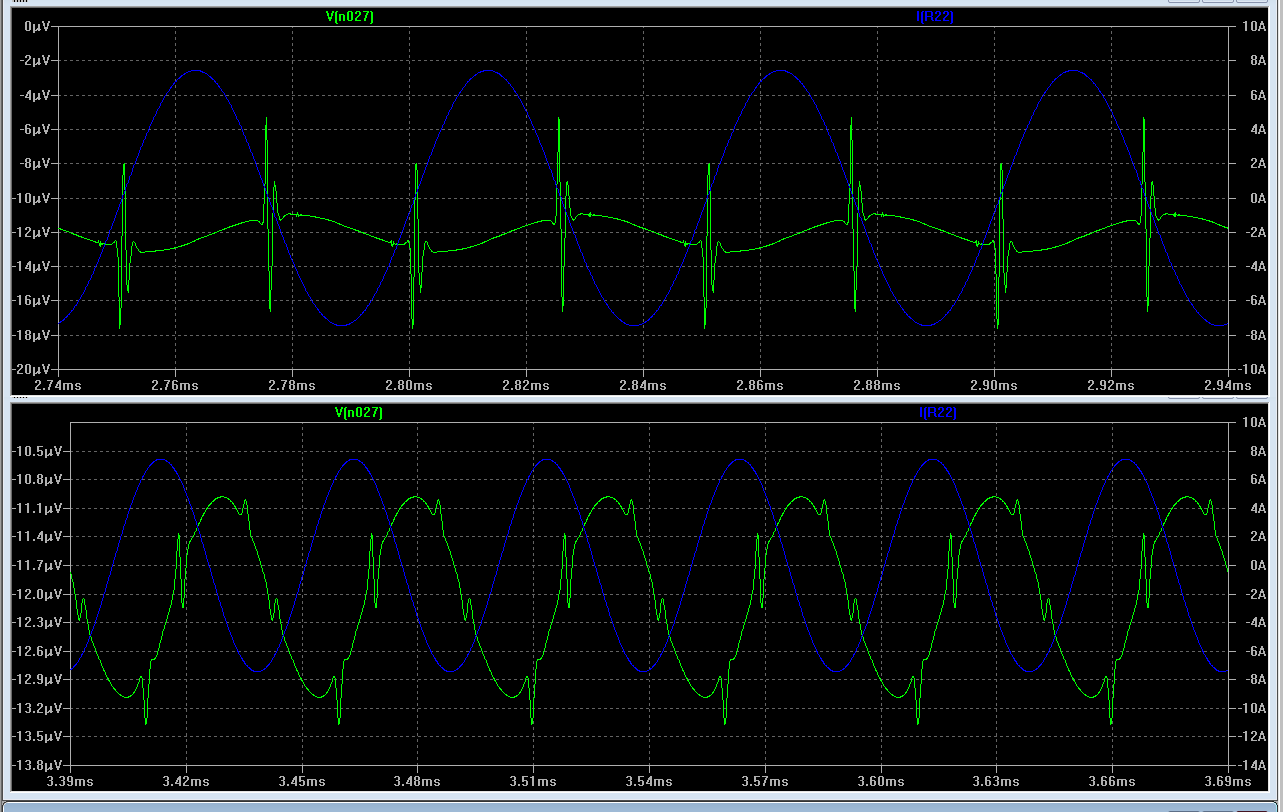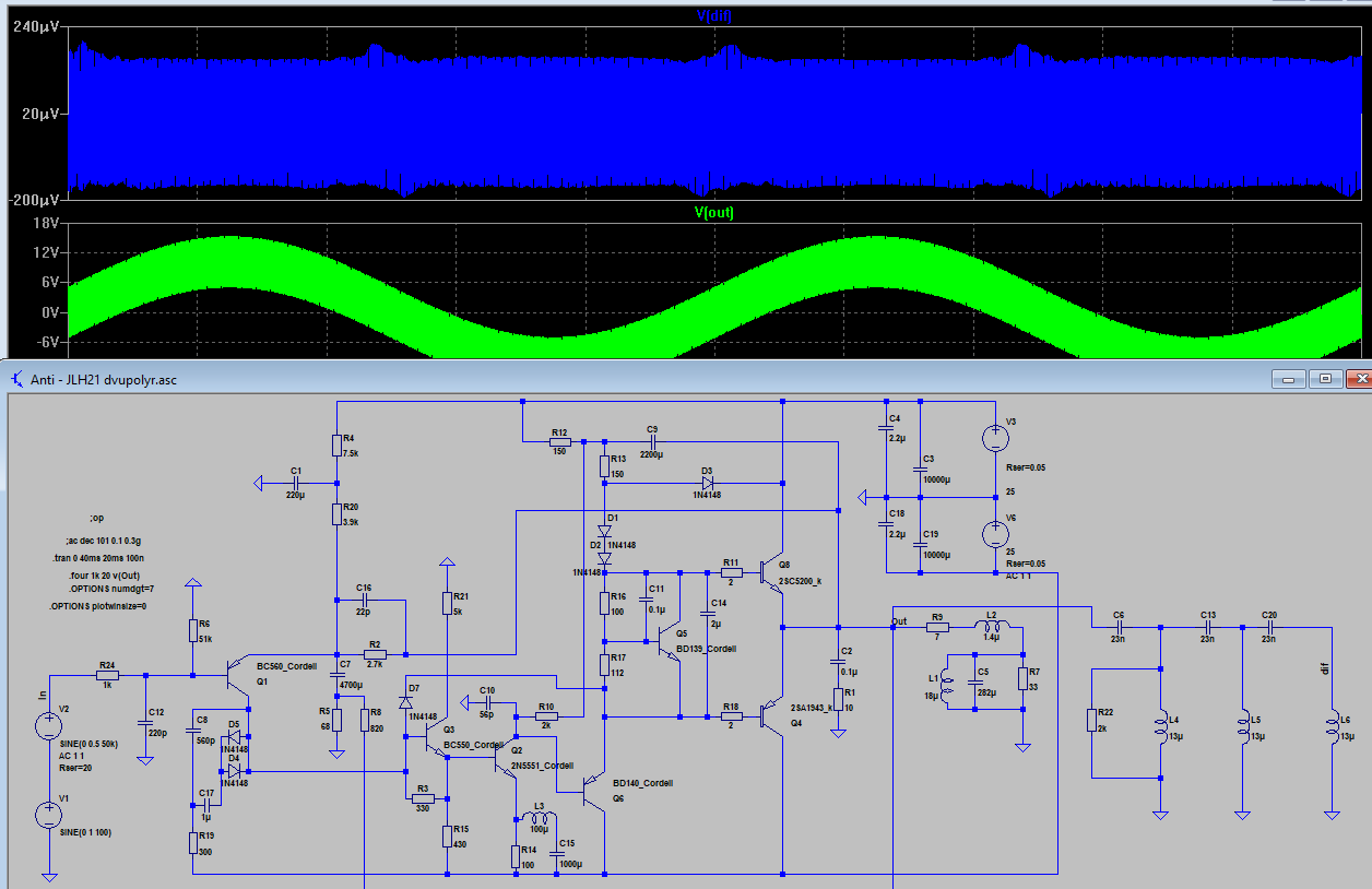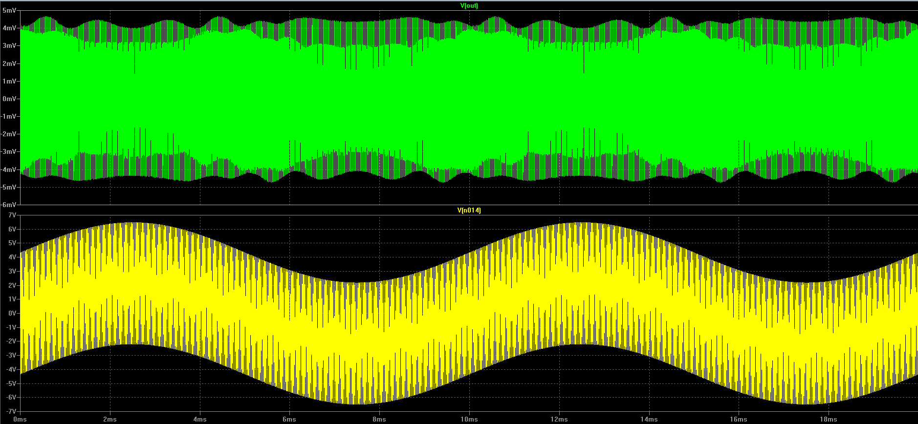 И так - инвертирующий сверхлинейник, на выходе 2 пары, ток покоя каждой - 170 мА. Смотрим на вход - как видно всё говнище происходит в момент прохождения 0. Т.е. вот эти вот выбросы и есть следствие вкл/выкл. транзисторов, разностное 10 мкВ. Это на одной частоте 20 Кгц, а на музыке представляешь количество этого говнища, которое нужно отработать ООС? Загоняем ВК в класс А - разностное падает до 2 мкВ, соответственно и искажения снижаются...