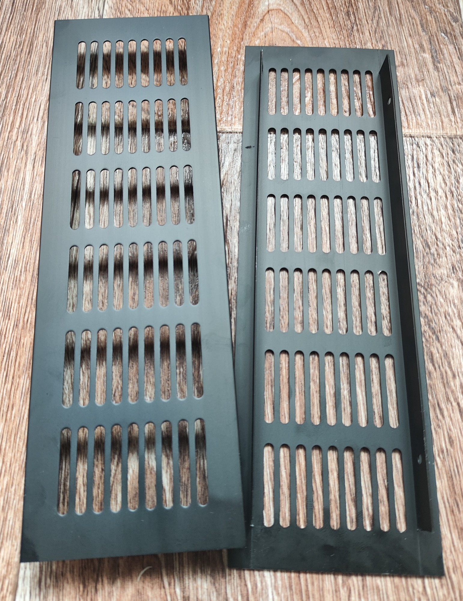 Взял на озоне решётки, на дверь нужны были, а оказалось что очень симпатичные. Даже из алюминия. Как раз подходящие для вентиляции корпуса. Самому аккуратно насверлить сотни отверстий задача сложная, а вот такую врезать минута делов. И будет прям как на фирменных старых транзисторниках.
