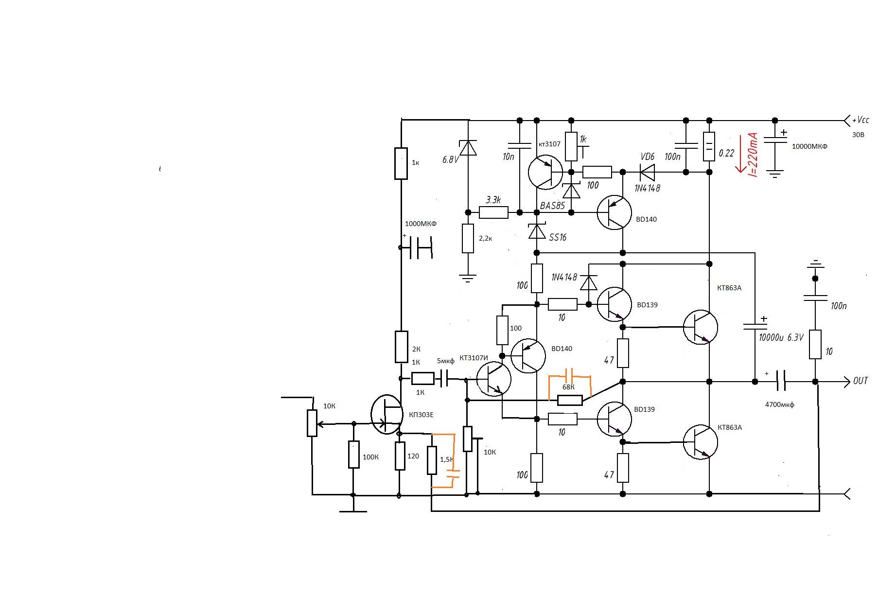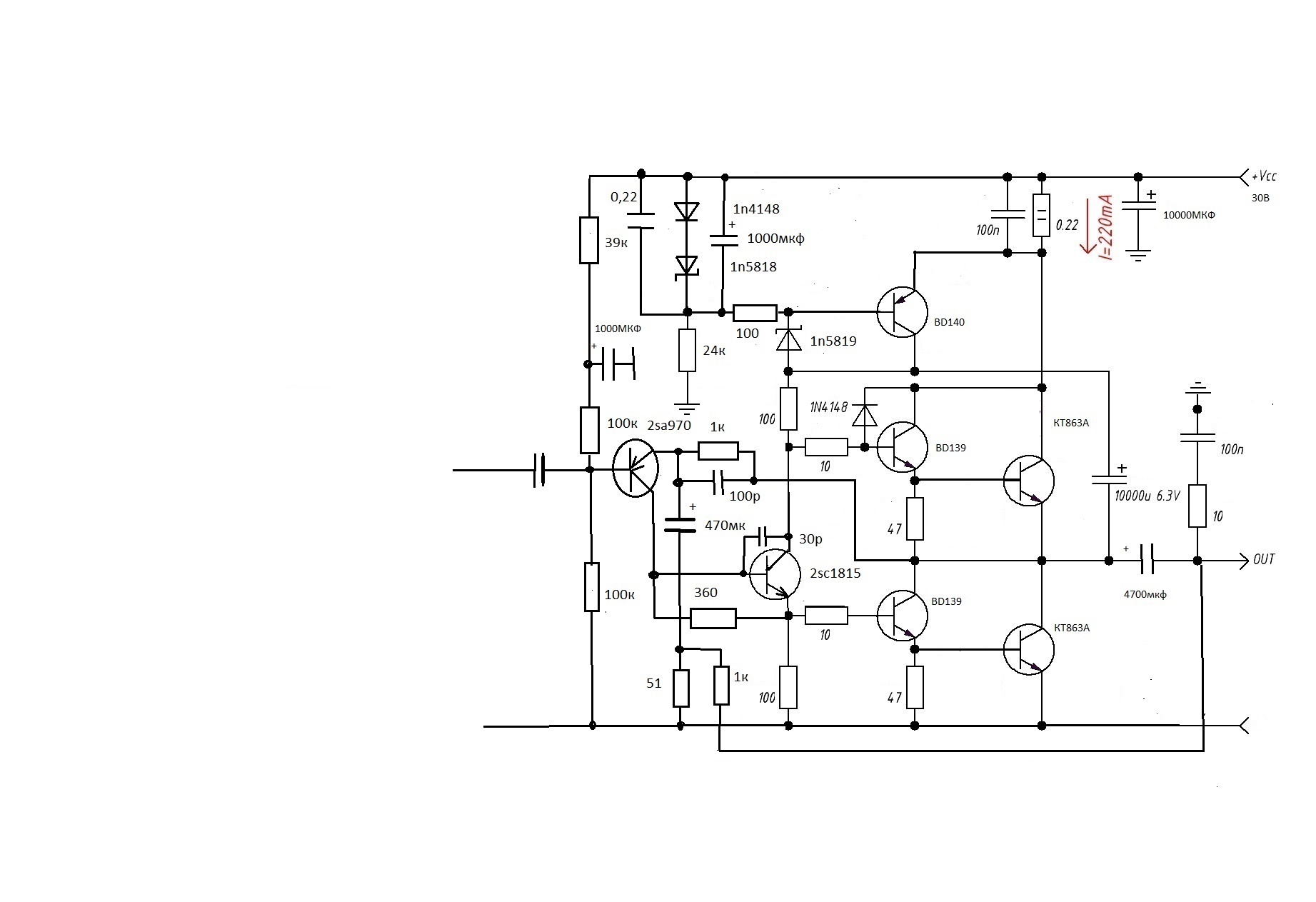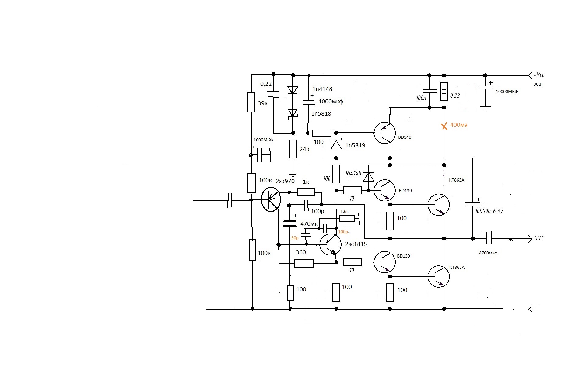 Классика. Дифкаскад+УН+квазикомплементарный выхлоп с диодом Баксандала и защитой по току. Двухполярное, АВшник.
