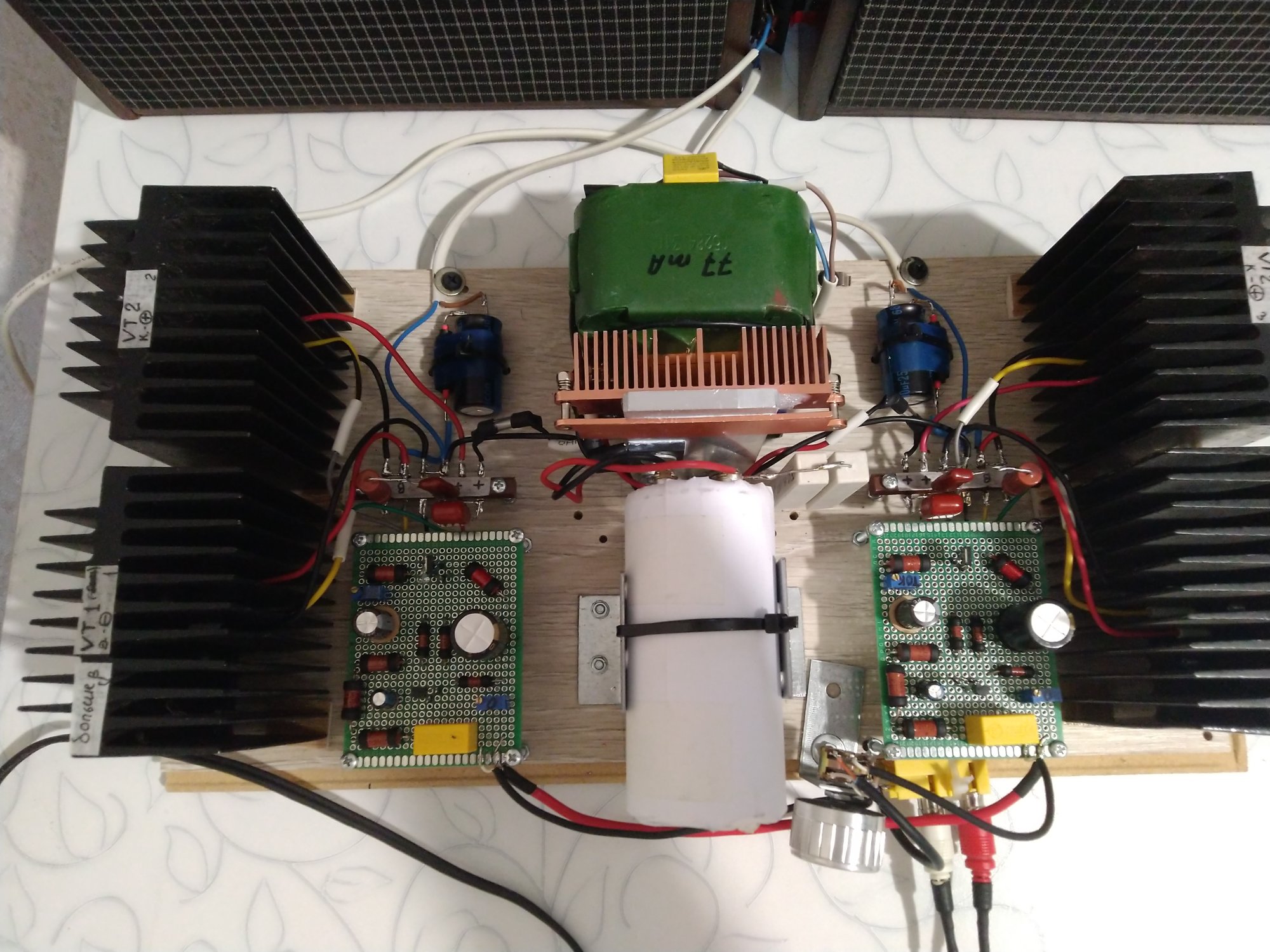 Может кому будет интересно. Несмотря на имеющиеся на этом форуме высказывания о том, что усилитель JLH хорошо работает только на нагрузку 16 или в крайнем случае 8 ом, решил все таки собрать усилитель под имеющиеся у меня 4-х омные динамики. Тем более сам автор допускал работу своего под нагрузку 3 Ом. Собирал по классической схеме, единственное добавил на выходе цепь Цобеля. Питание - трансформатор ТПП 284, конденсатор 2 шт. 15000 мкф, между ними резистор 0.18 Ом. При токе покоя 1.2 А на канал напряжение около 19 вольт. Резистор R1 - 47 Ом, R2 - подстроечный 330 Ом, конденсатор на выходе 6800 мкФ, на входе 1 мкФ. Транзисторы: входной - bc556c (коэф. усиления 450), драйвер -2sc5707 (коэф. усиления 300). На выход (из имеющихся у меня 2т809а, кт908б, 2т903б, 2т808а, кт 902а) поставил кт 902а, как с наибольшим коэффициентом усиления, измеренном в диапазоне тока коллектора от 50 мА до 3000мА., и наилучшей его линейностью. Отобрал две пары с усилением 115 и 125. Для выяснения влияния параметров транзисторов на характеристики усилителя первый вариант собрал на парах с усилением 75, второй на 115 и 125. Во втором варианте искажения усилителя уменьшились почти вдвое. Осциллографа к сожалению нет, поэтому проверить на возбуд., меандр и пр. возможности не имеется. Поэтому результаты только в RMAA. Измерения проводились при токе покоя 1.2 A, напряжение на выходе около 3 Вольт, нагрузка 5.1 Ом. После часа работы нагрев транзисторов около 50 гр. (палец, приложенный к корпусу транзистора, спокойно терпит 5-10 сек.). Звук без заметных искажений, не утомительный, можно слушать продолжительное время.