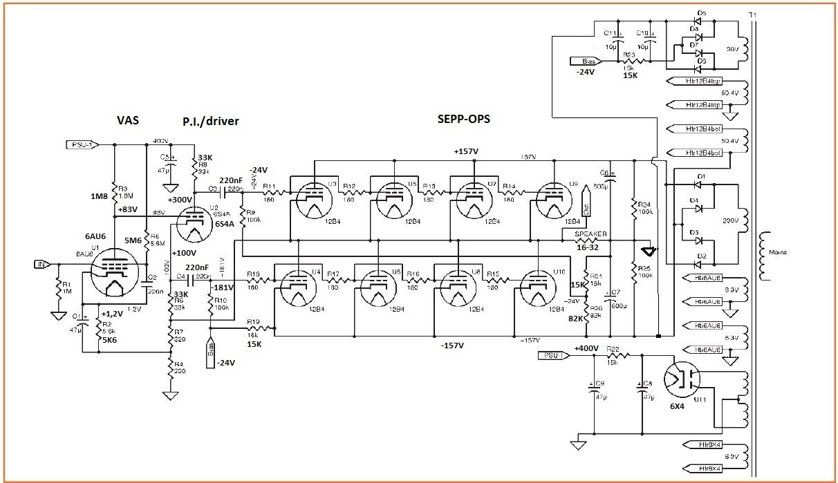 Питание повторил по схеме Онгаку, там вторичка со средней точкой, она держит поровну напряжение двух этажей банок. Минус выпрямителя -земля.одно дело линию карандашем начертить,а другое -обуздать 2кВ питания.А так да,с заходом через нуль 20..25ватт в пределе до клипа о чем и пишут в документации на вилсентон r800