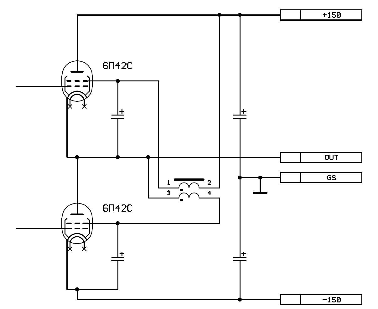 Это моя идея создания выходного каскада SEPP с пентодами в пентодном режиме настроенным на работу в классе AB1, чтобы избежать управления другими сетками с помощью активных элементов будь то лампы или транзисторы,Не умел. Очень много лишних деталей. А проблема решается применением двухобмоточного синфазного дросселя. Переменная составляющая экранного тока синфазна, постоянная составляющая противофазна. Питание от анодного источника для выходного каскада. Дроссель не подмагничивается, как следствие размеры маленькие.