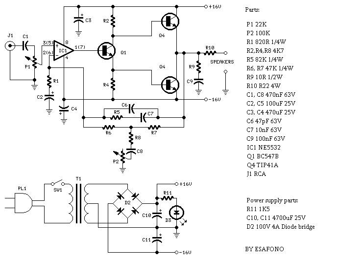 Делал подобную макаку для испытания транзисторов и установки режима выходного каскада и драйвера. ООС невелика, сигнал паршивый, выходное конское. В принципе. как-то работает. Не хватает предкаскада и заведенной в него ООС.
