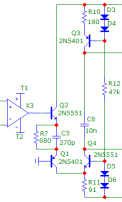 Это да, сюда тройка просится оптимально. Еще для выравнивания полосы можно подгрузить коллекторы Q3, Q4 через 300~390ком на землю.