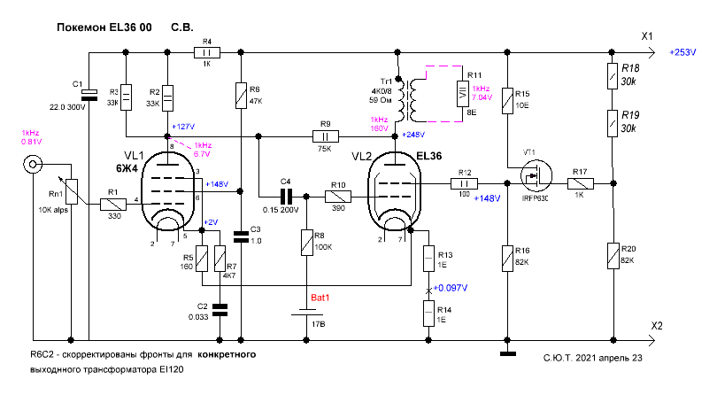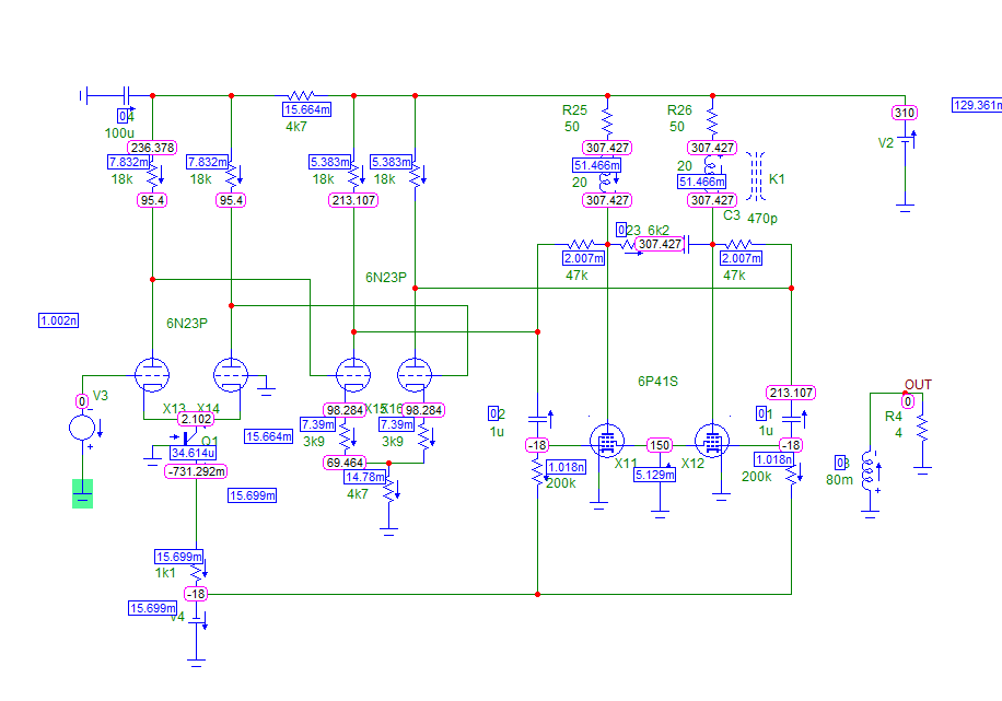 Наверное я туповат. Вот у нас резистор между анодом драйвера и анодом выхода. Там нет конденсатора чтоб отсечь постоянку от сигнала. На аноде драйвера по постоянку у нас около пропитания, на аноде выходной лампы на несколько вольт меньше анодного. Как это между собой стыкуется?