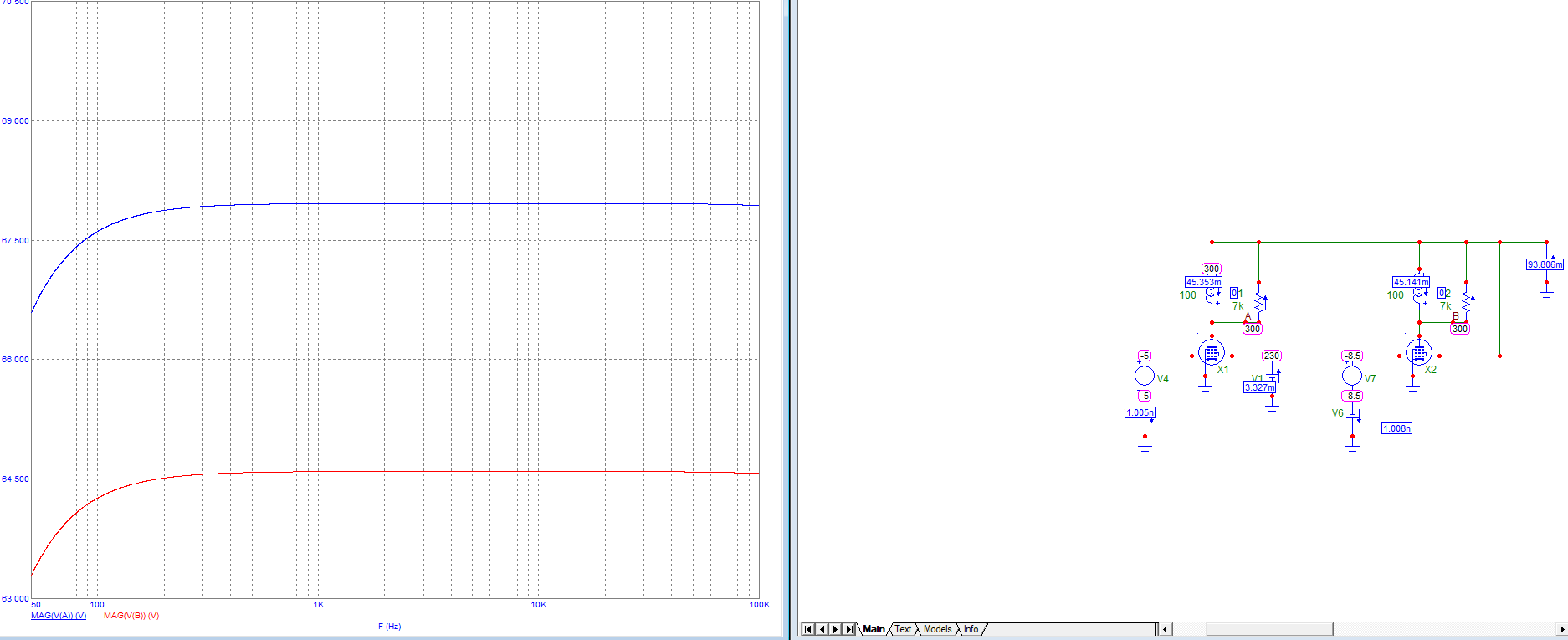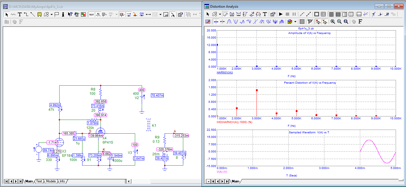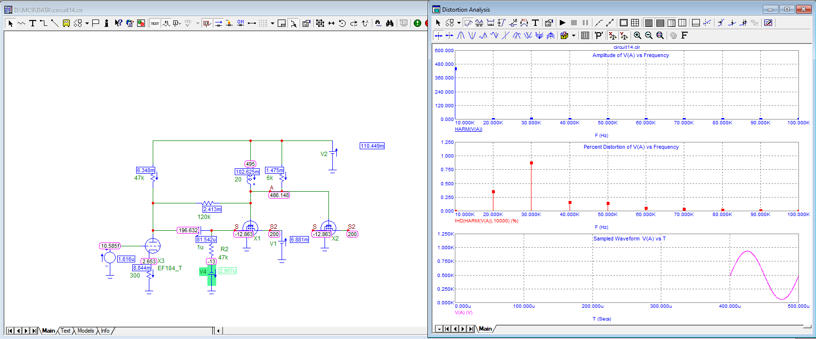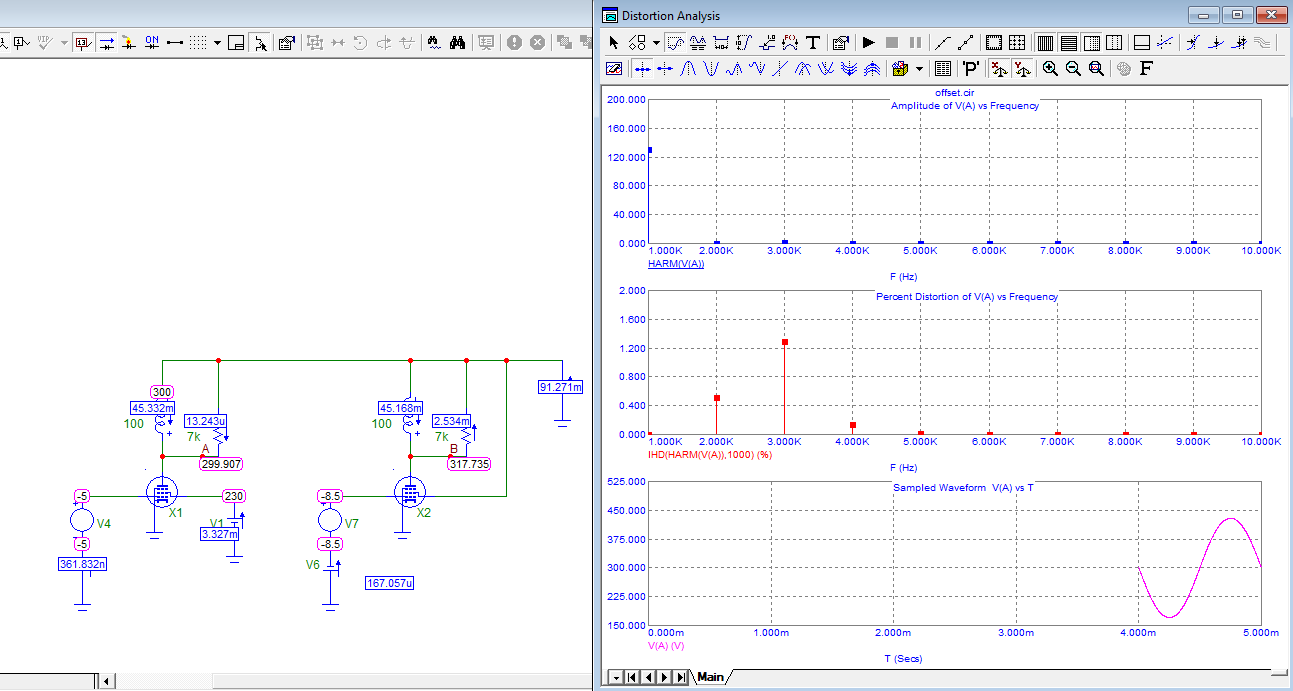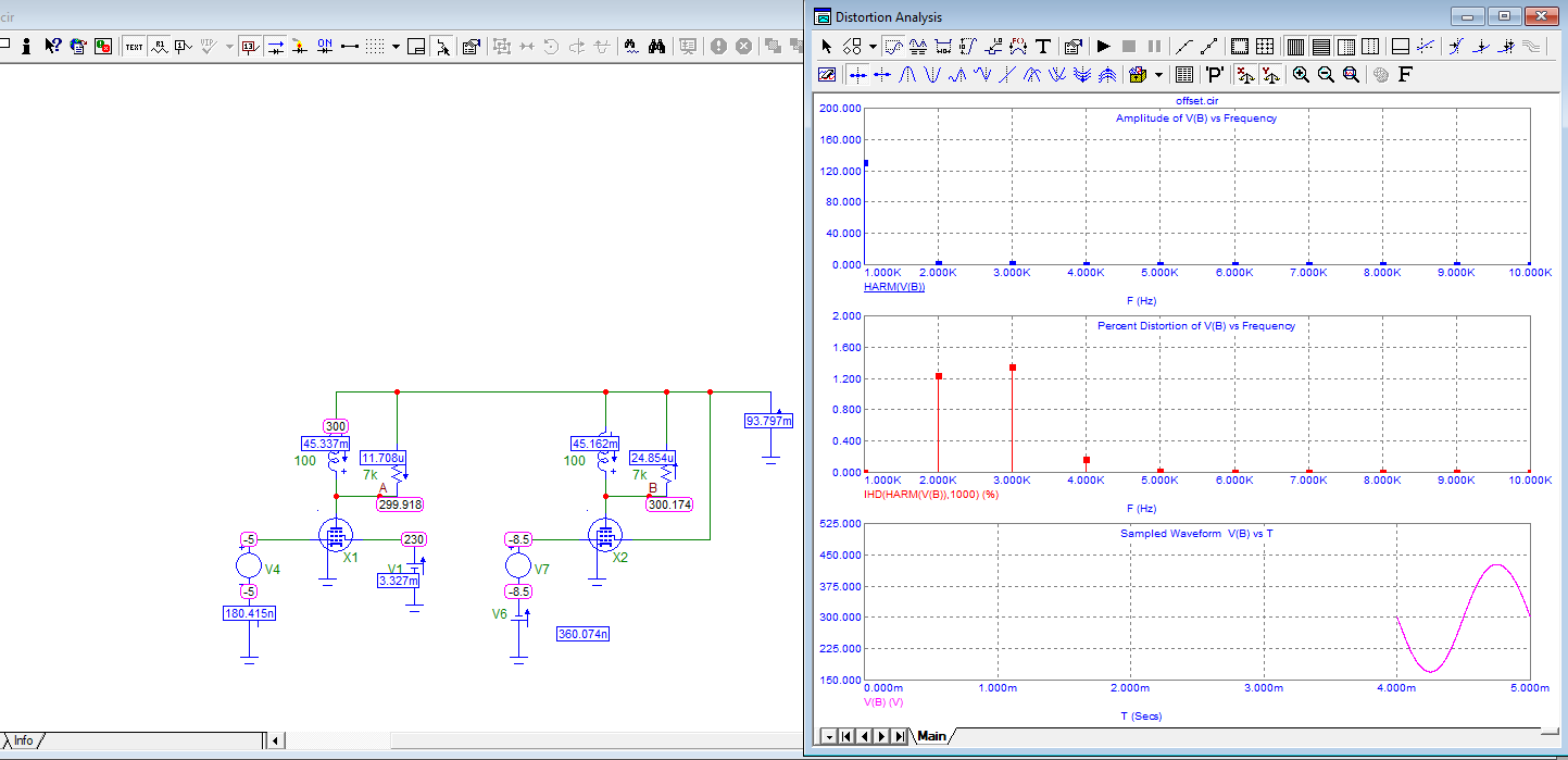 Вот как влияют напряжения на сетках. Ток анода одинаковый, нагрузка одинаковая. В первом случае смещение -5 вольт, во втором -8.5 вольт. Усиление в первом случае 68, во втором 64.5 раз. Вторая гармоника в первом случае меньше. Лампа 6П14П