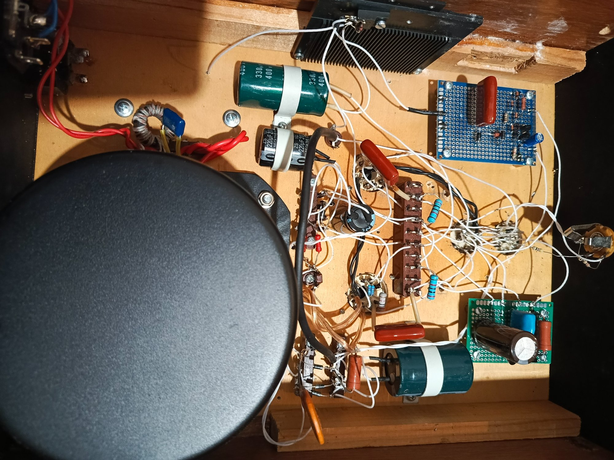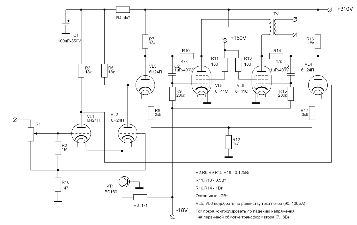 Тип транзистора - опечатка. На самом деле BD139 в оригинале. Но сюда любой npn годится. Остальное, вроде так. За исключением того, что у меня нет регулятора громкости, а усилитель сделан в виде моноблоков с балансным входом. Был. Прямо сейчас его переделываю в РР на 6П41С триодом. Один блок уже переделал, второй на стапеле. С того, что готов, кое какие измерения уже снял в первом приближении. Уровень фона теряетсч в собственных шумах ламп. Выходная мощность 12 ватт. Кг на полной мощности 0.8%. На мощности 1 ватт 0.07%. Но я ещё лампы на свежие не менял. Это со старыми.