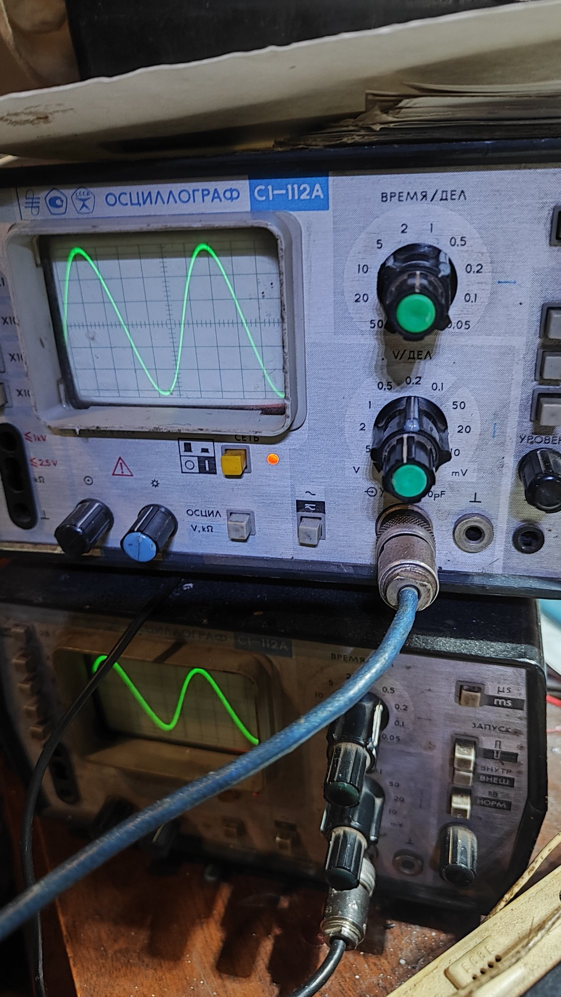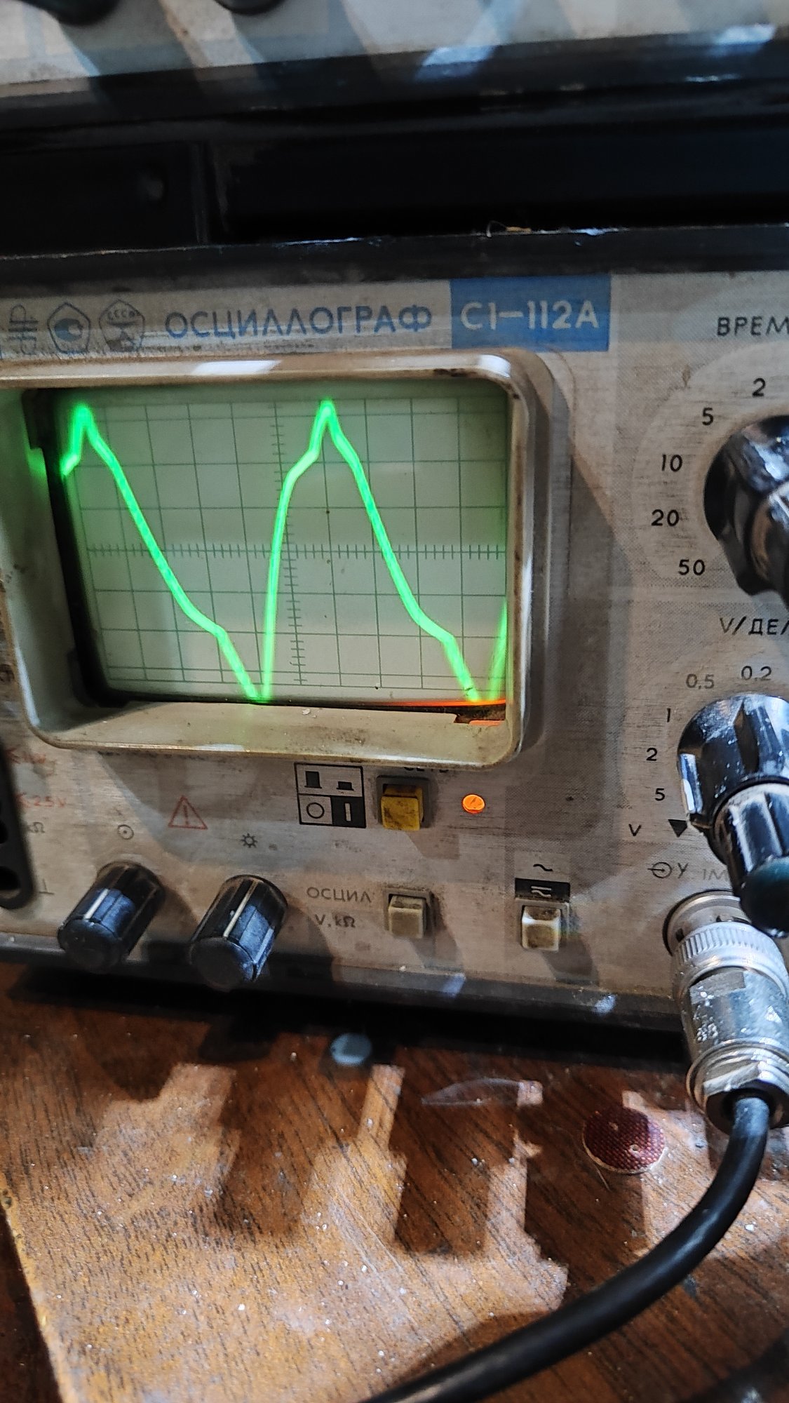 У нас импеданс катухи 7 Ом. Значит, для добычи 1 А нужно 7 вольт эффективных на выходе генератора. 7в эфф это 10 в пиковых, от средины до макушки или 20 вольт от макушки до макушки. У вас скока на выходе генератора, скопом покажите.Вот 0.7а ток при 16в))
