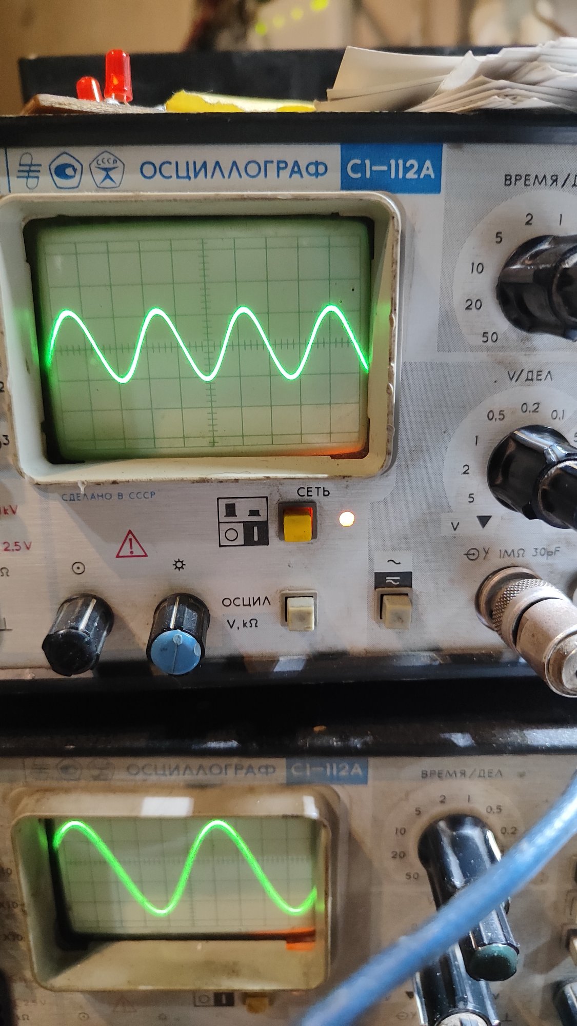 0,6А на пике, значит, 0,6 да умн на 0,7 это 0.42 А эфф.Вот смотрите сами фото. Верхний осцил к резистору. Вольт/деление 0.2, ток выходит 0.6А. Измерено на резисторе 1 ом. Но это уже при напруге питания усилка 16в. Синус чистый на нижнем осциле,непосредственно на катушке, это без токового транса. С ним искажения как на фото выше