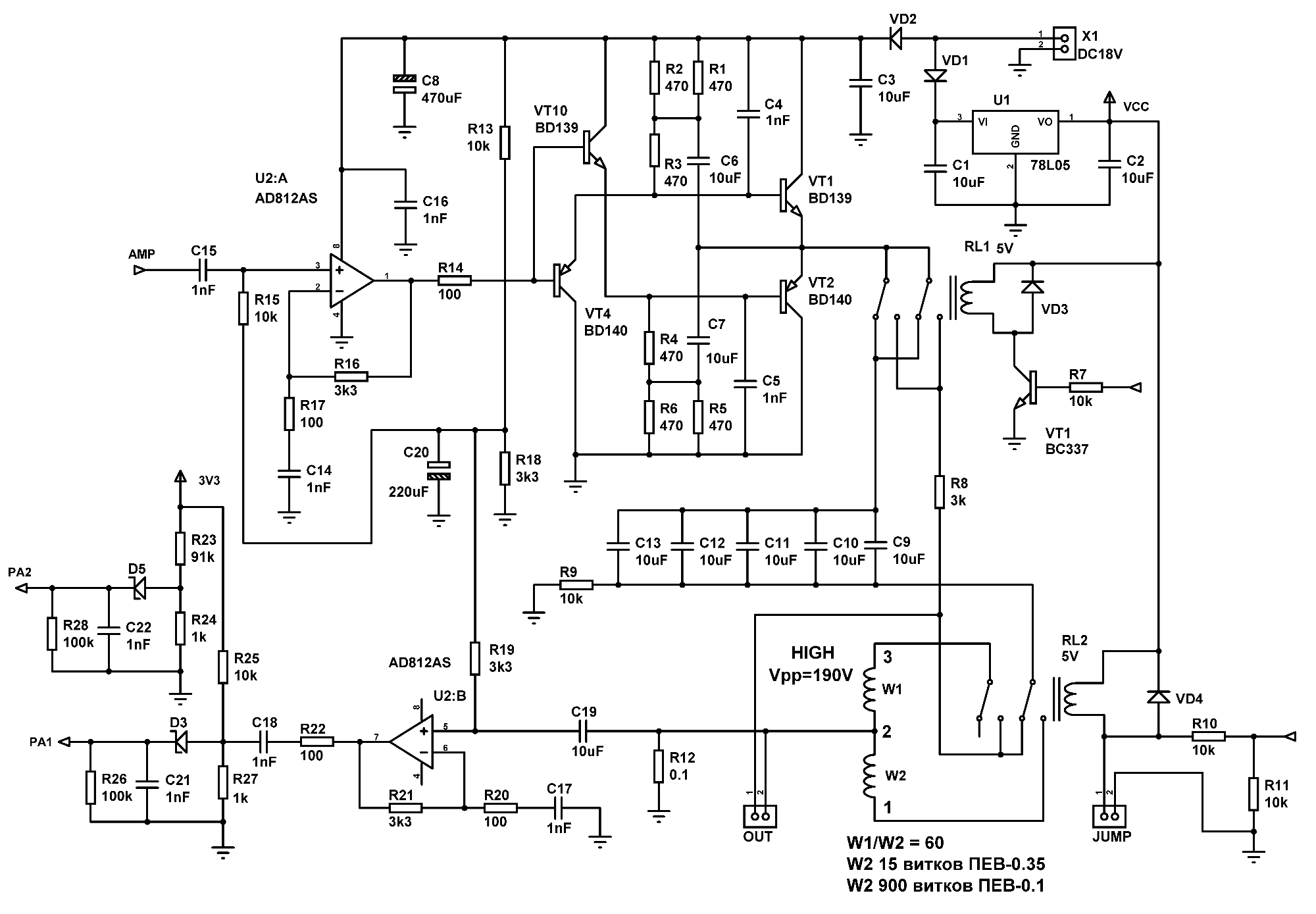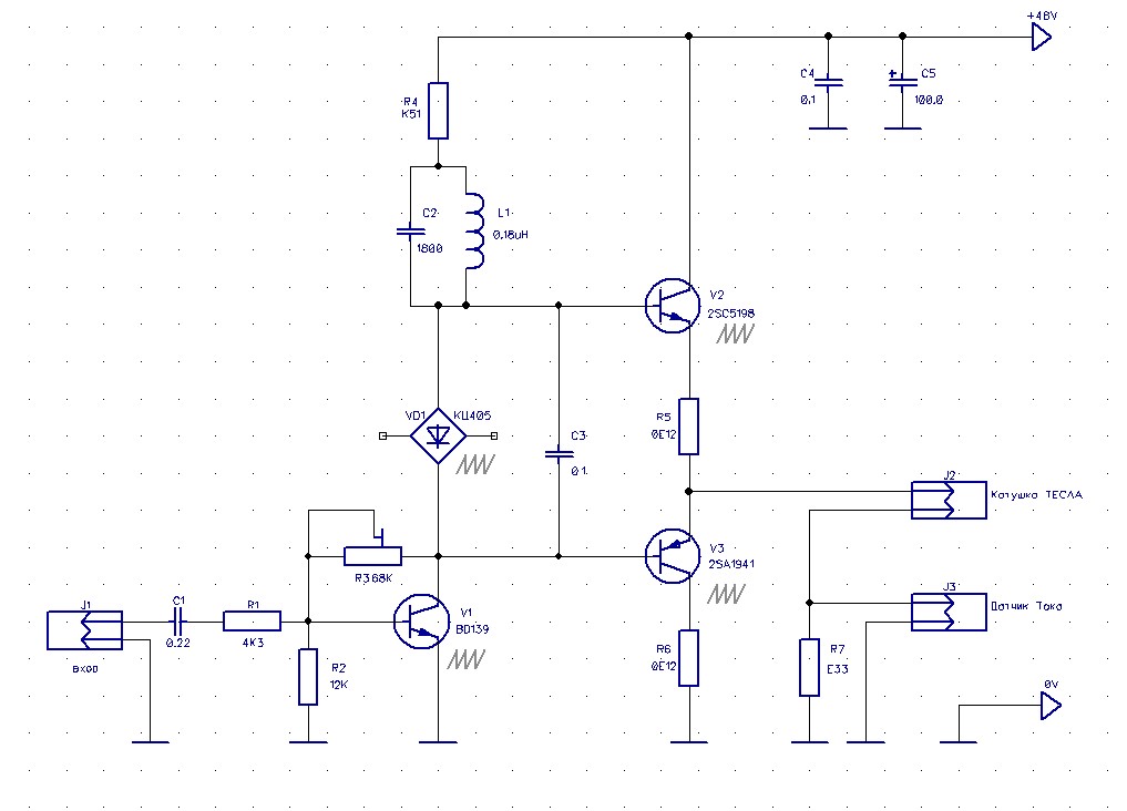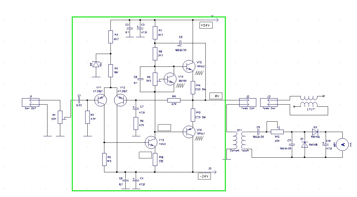 TIP142/147Т в корпусе ТО220 90Вт рассеивают. По Вашей схеме (вложение) у меня еще возникли следующие проблемы - необходимость изменения смещения резистором R3 для каждого типа катушки , чтобы была более-менее нормальная синусоида. До и после Вашей схемы перепробовал полтора десятка схем для катушки Тесла, взяв за основу промышленные транзисторные УМЗЧ 70-90г, остановился на описанной мной выше. Критерии простые -повторяемость-результат-стоимость. Думаю, можно еще ее улучшить, если подобрать комплиментарную пару. Глянул-а и схемы-то простой нет для подбора. Придется придумывать, чтобы базовые токи можно было менять и как/чем мерять)).