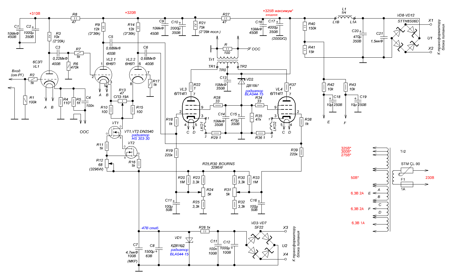 Эт Юрий Анатольевич таким образом растапливает прохладный звук 6Н1П.Кстати, обратите внимание на номинал анодного резистора первого каскада.