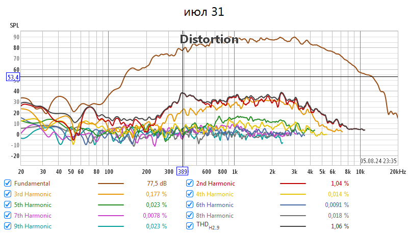 Рассказать как в REW увидеть искажения с гармонями.