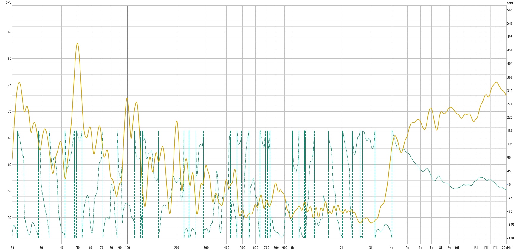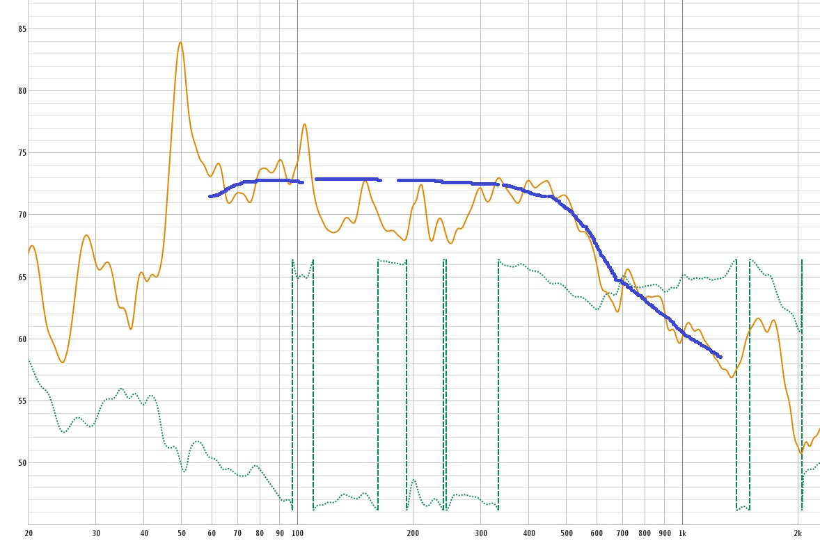 Йёй... 44 и 45 Гц, два резонанса подряд. Ниже 40 Гц нужна открытая дверь в коридор, для поддержки полосы вниз. Можно пробовать ФИ на 30 Гц, объём позволяет (но себе я не сделал, для объёма 90 литров)))