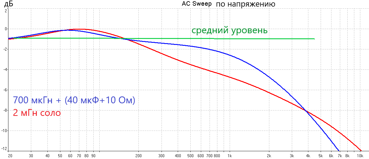 Таким образом, если бы катушка вследствие КЗ части витков издохла до 700 мкГн, а 40 мкФ+10 Ом были на месте, то на частоте 1 кГц такой ФНЧ дал бы -1,5дБ от среднего уровня. Однако у Вас наблюдается (?) -7дБ! Более похожа на Ваш случай АЧХ ФНЧ в составе одинокой катушки 2 мГн, у неё -4дБ на частоте 1 кГц. И тоже не совсем то...