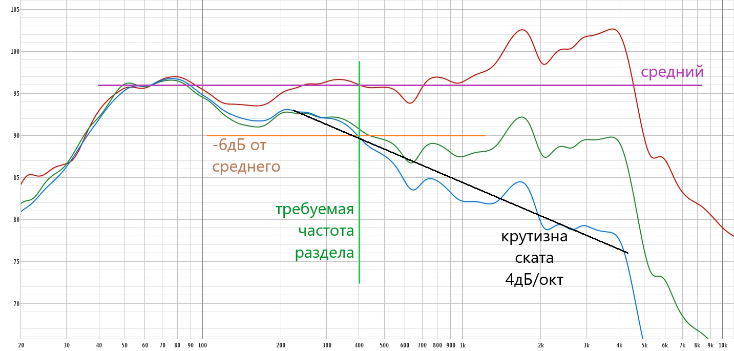 При 4,5 мГн требуется частота раздела 400 Гц, и это - при идеальном сведЕнии полос, а при неважном и того ниже. А СЧ динамик даже без фильтра имеет спад в сторону мидбаса (почему? чистый спада не имеет. Передемпфировали бокс?), и даже близко не даст такие уровни 300 и 400 Гц, тем более с фильтром. Мой вывод: 4,5 мГн - мынога. Сильно мынога. Для поддержки 4,5 мГн нужен СЧ, спокойно работающий в боксе от 200 Гц в полку. Для чего надо, чтобы его резонансная частота в боксе была под 100 Гц, а это уже литров пять внутреннего объёма для СЧ бокса... и 4ГД-8е не подходит ну никак.