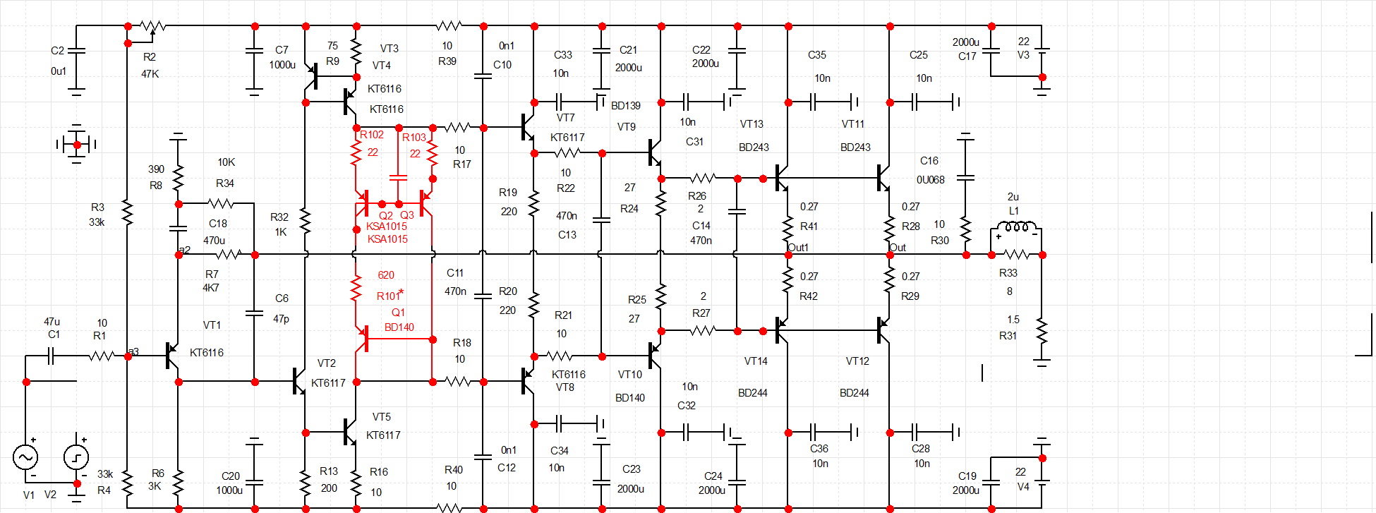 Это первый вариант УН, я просто взял классический оппозитный однокаскадный УН без наворотов, она полностью рабочая, можете попробовать.