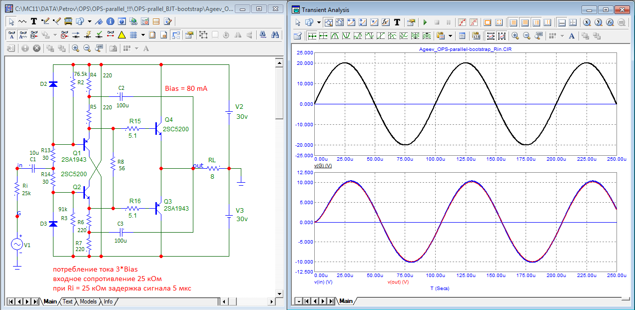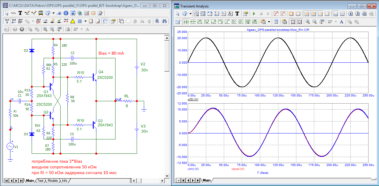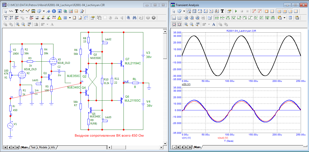 Попытка смоделировать его как есть ни к чему хорошему не привела, одна полуволна ограничивалась очень рано. Тогда я решил глянуть входное сопротивление ВК чем то напоминающего параллельник Агеева. Его входное сопротивление оказалось равным всего 450 Ом, причем очень кривое. Входное сопротивление параллельника Агеева также сравнительно невысоко ~ 25 кОм (во многом ограничено делителем на входе для обеспечения нуля на выходе). Входное сопротивление параллельника Агеева можно увеличить примерно вдвое если входной делитель запитать с вольтодобавки.