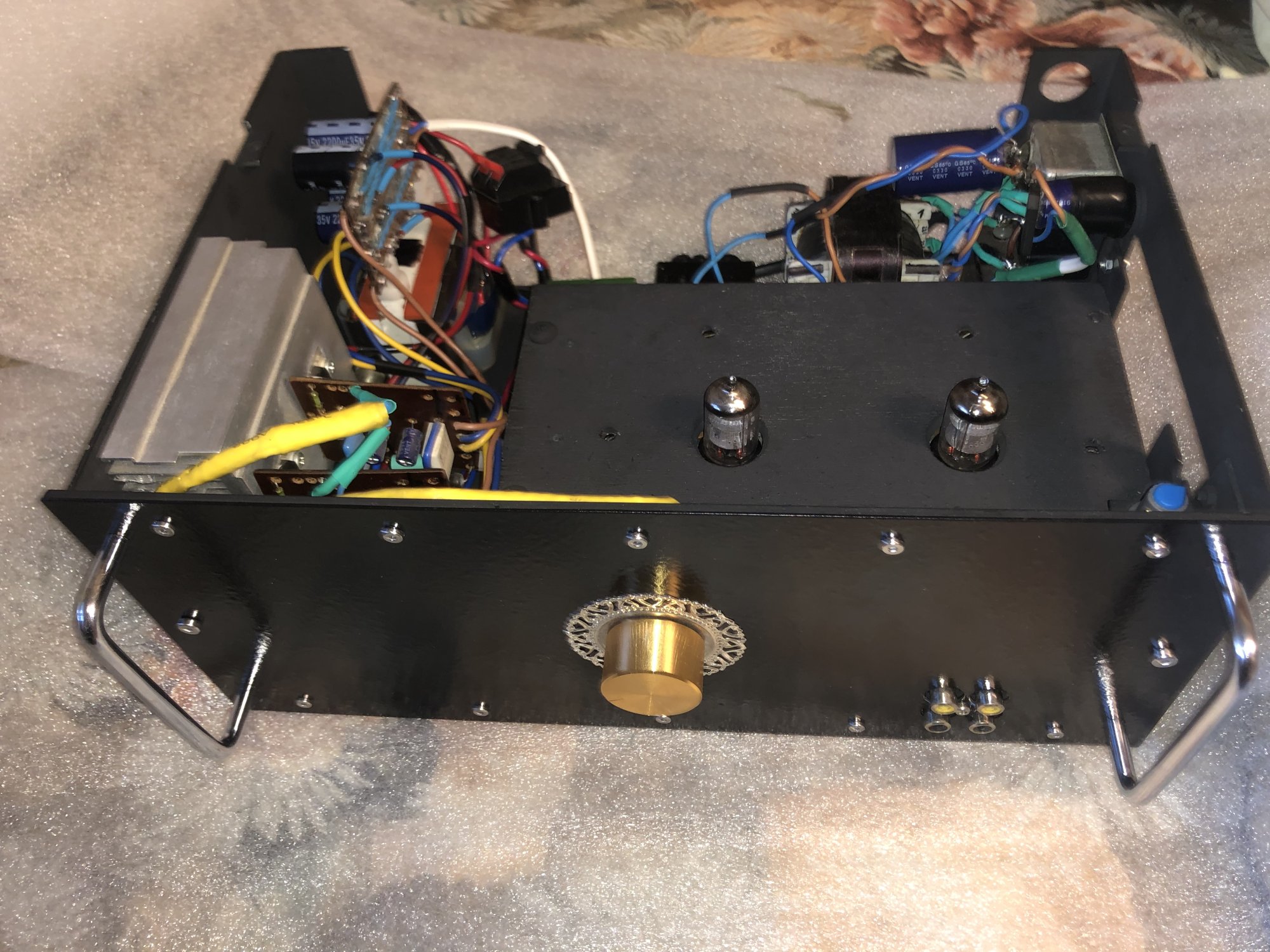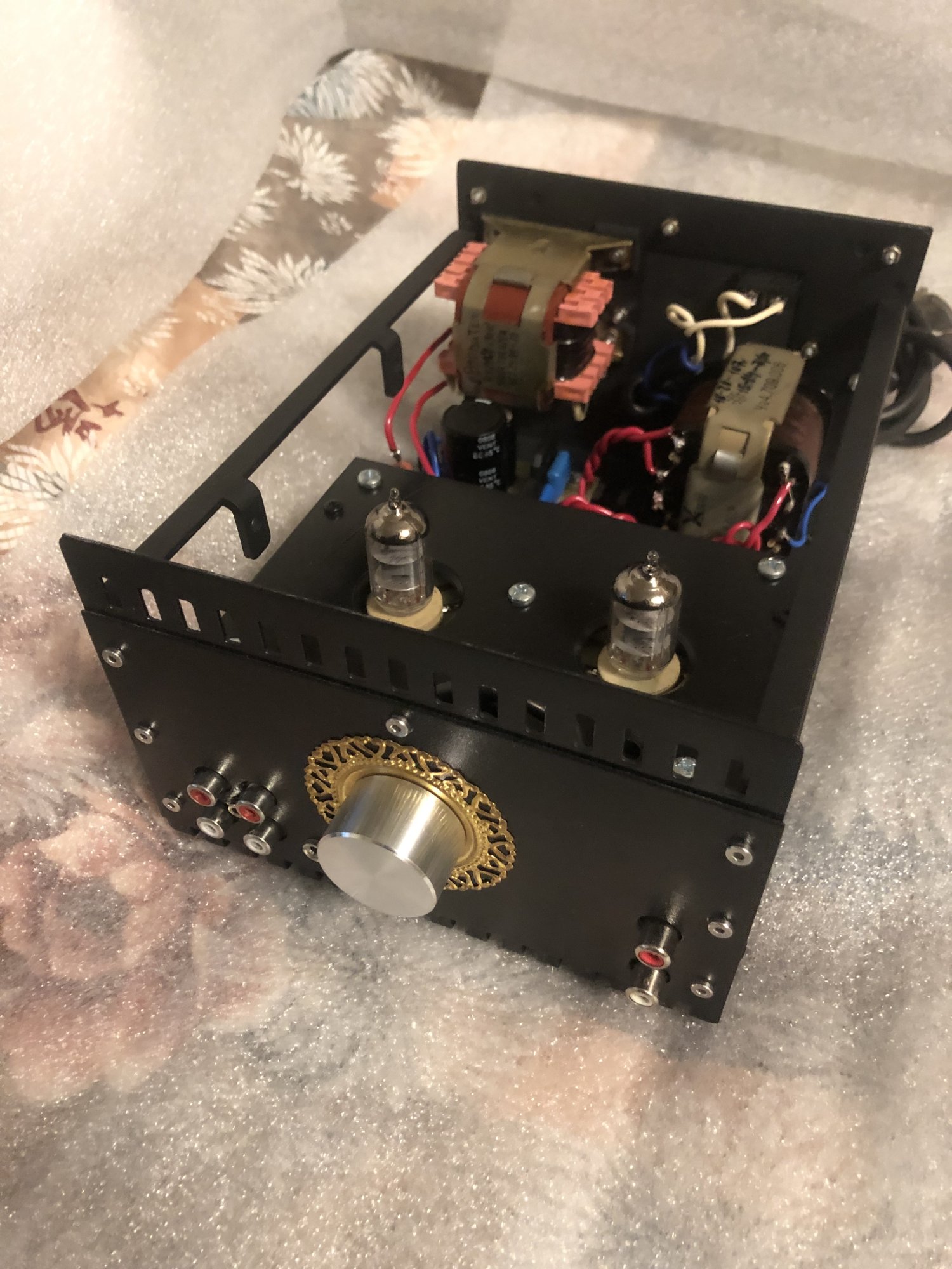 Отверстий под лампы всего 4, а нужно 6. Поэтому предусиление на 6н2п разместил в подвале на уголках, горизонтально.