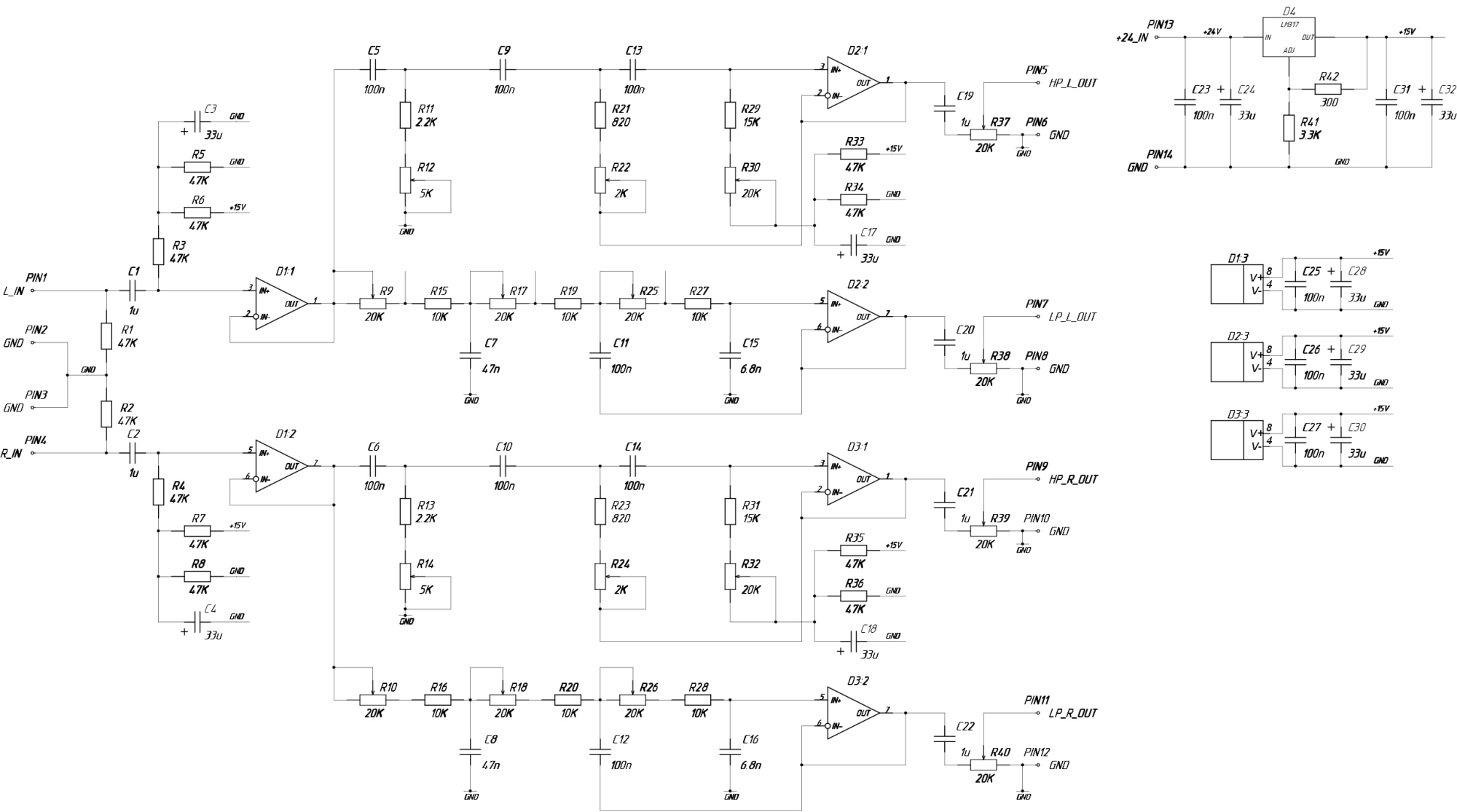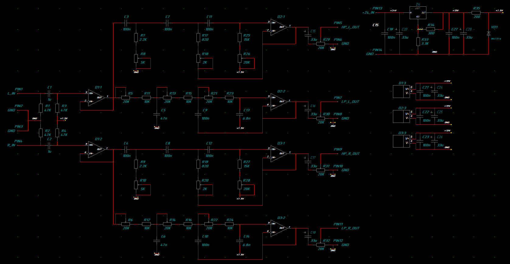 Я не игнорирую прям питание однополярное, просто не определился как лучше быть: всё изделие будет запитываться от импульсника готового в 24В. Я понимаю, что с помощью резисторов и конденсаторов можно из +24 В сделать ±12В и уже от них запитать ОУ. Можно даже LM3x7 поставить и сделать какие-нибудь ±10В стабилизированные и подчищенные, т.к. те самые +24 В будут усилители питать. Я как бэ там в начале сомнения о правильности такого двухполярного высказал, но никто особо не обратил внимания, поэтому я по однополярке пошёл дальше, опираясь на картинку от блюзмобиля. Как выше и написал, потенциал Uпит/2 я сделал на стабилитроне и... насколько это правильно я тож не знаю, ибо делители к Uпит влияют на спады фильтров. Если стабилитрон у себя не найду нужный... ну какой-нибудь 1N4737A... то всё сделаю как задумал. Если не найду, то я утром, по-быстрому, накидал схему со второй LM317, которая из +15В делает +7,5В... ну просто потому что всё это у меня есть и затраты на поделку стремятся к 0 ))) На доступных и удобных мне площадках копеечный стабилитрон от 200р продаётся просто, а моя жаба против.
