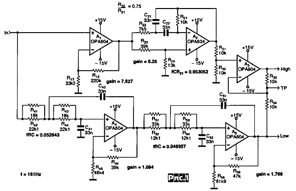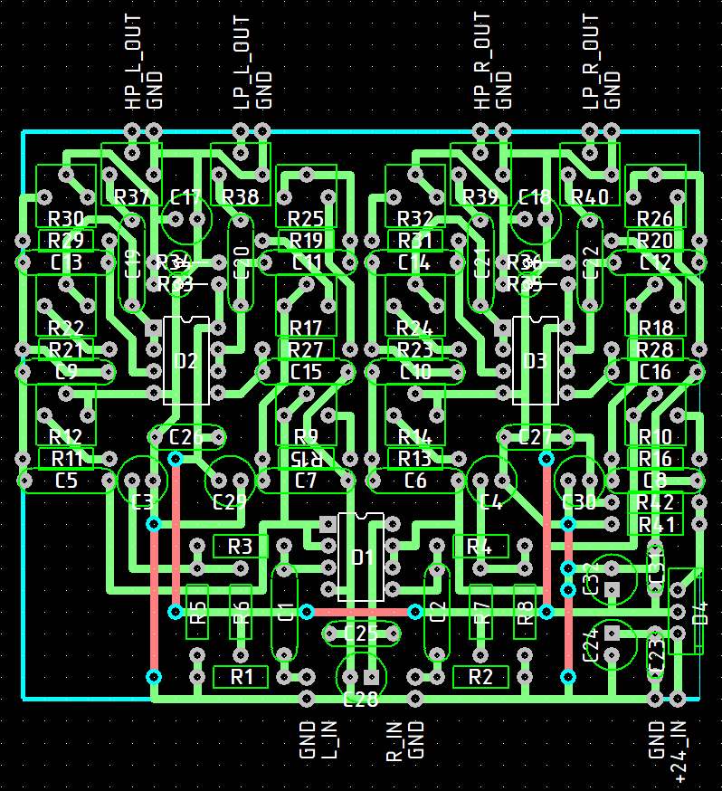 У меня на этом же принципе для 3х полоски есть в железе активный фильтр. Ещё в далёком 2005м я его спаял, даже печатную плату изготавливал под него... даже 2 зеркальные, т.к. планировал его в готовый усилок пихать, который тоже был отзеркален, но... когда динамики кривые, а у меня они были кривые: 2х25ГДН1-4 + 5ГДШ5-4 + 10ГДВ1, найти нормальную частоту, где они более-менее ровно сошьются очень сложно. Когда же я пришёл к тому, чтобы заменить динамики, у меня уже были в макетах фильтра на AD1940...