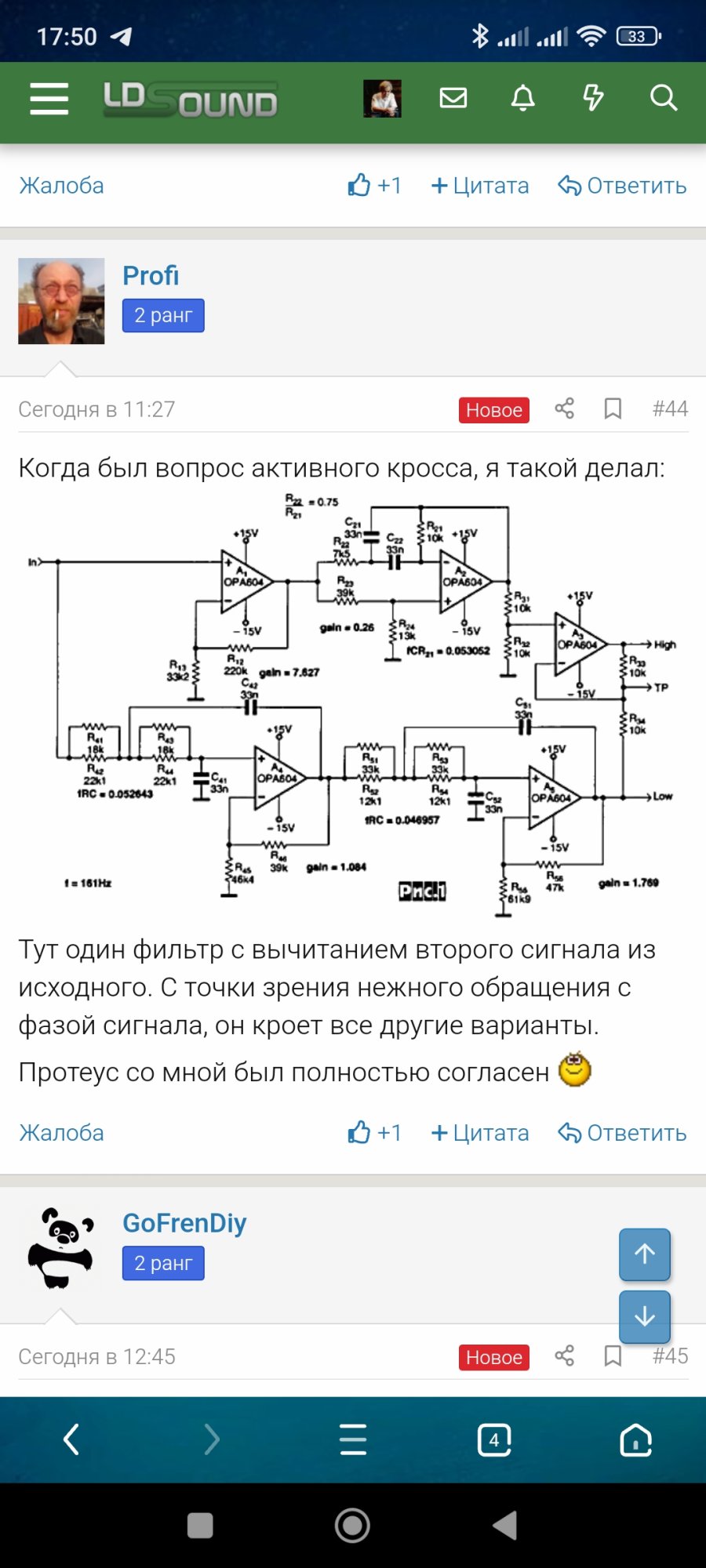 как я ранее и писал - это работает только с нормальными, ровными динамиками, а когда по краям диапазона у динамика какие-то артефакты, то либо смещать частоту сшивки, либо сильнее заваливать спады. Но может так случится, что у другого динамика велезут артефакты, если начинать сшивать на других частотах. Фильтр с вычитанием у меня есть и я тоже думал что одним резистором перестраивать частоту сразу на 2х полосах - это будет надёжно, добротно, хорошо - нет! Практично - ДА! _hm_ ВЧ мне всегда хотелось отодвинуть вверх, т.к. 10ГДВ зудели сильно, если ниже 5 кГц пускать, да ещё и 4...6 кГц на 5 дБ были выше, чем 7...10 кГц, а 5ГДШ5-4 после 5 кГц дикую пилу на АЧХ имел, а на 6.5 кГц так вообще неслабый такой выброс. Вот и получалось, что имея красивые спады и согласование фильтров по ровному уровню, я получал кривую АЧХ результирующую: 5ГДШ, вроде бы, заваливается на 5 кГц, но за счёт выброса на 6.5 кГц по факту играл динамик до этих вот 6.5 кГц. ВЧ, вроде бы, более-менее ровно начинало резаться на тех же 5 кГц, но за счёт провала 7...10 кГц, выставить нормально уровень не получалось, ибо лез СЧ. Тут бы вот раздвинуть хотя бы динамики, чтобы ВЧ начать резать по уровню провала, а СЧ резко, чтобы 6.5 кГц не лезли сильно - но такой возможности нет. Ситуацию на СЧ/НЧ переходе я выше тож разрисовывал, когда 5ГДШ на Fs гудит и мешает сшивке - там просто не хватало мне порядков, но сочетанием уровня и поиском удобной частоты, 25ГДН и 5ГДШ более-менее ровно сдружились - ну насколько мне позволяла комната измерить всё это на расстоянии 20 см. Эх, всё это у меня похоронено на поймавшем клине жёстком диске - там всё это настолько наглядно было понамеряно. Тогда же я и решил вообще уходить на AD1940 ибо даже с изготовлением отдельного активного полосового фильтра для СЧ, далеко не факт, что у меня получится собрать 3х полоску нормально - была у меня в тот момент креатив аудиджи с кх-драйверами и то количество программных фильтров, которые я применил СЧ / ВЧ только лишь укрепляло мои мысли на уход к AD1940.