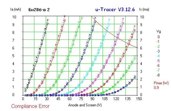 С нулевым смещением на сетке и анодным 40 в ВАХ совпадает с 6н28Б, дальше крутизна спадает немного, ток падает .