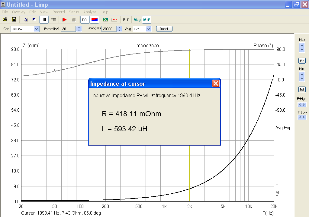 Итак, на приборе MASTECH MS5300 в катушку вставил ферритовый сердечник и добился 0,1 мГн, затем измерил в LIMP, вот результат.