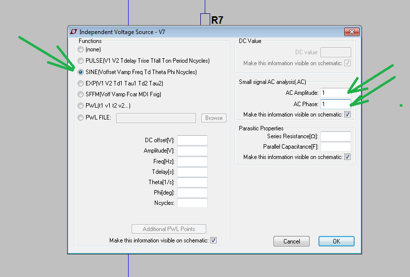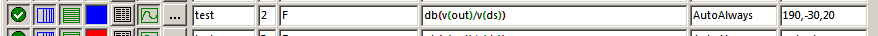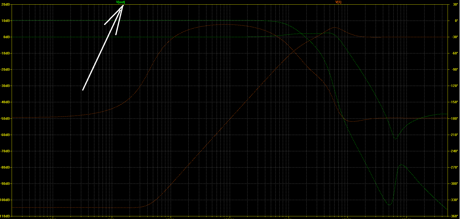потом запускаешь АЦ анализ, тыкаешь на АУТ, тыкаешь на единицу, выводится два графика, потом тыкаешь сюда мышью и дописываешь формулу чтоб было V(out)/V(1)