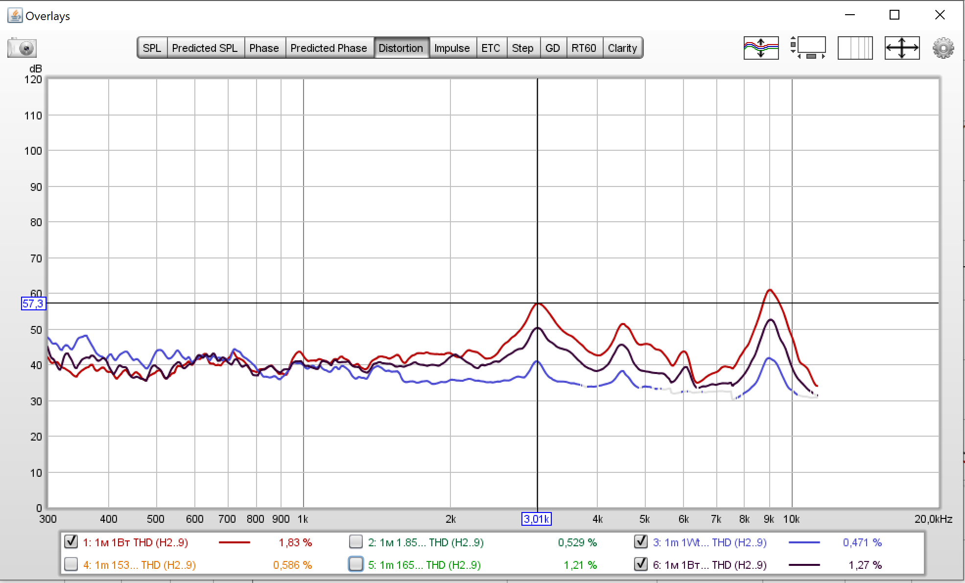 Мне было лень искать измерения до снижения частоты раздела с 3кГц до 2,5кГц. Суть проста, чем ровнее и ниже THD тем лучше, на графике THD выведен чёрным цветом. В моём случае ИНИ в СЧ динамике проявляли себя на 3кГц и это видно на первых картинках измерения ИНИ этого динамика, само собой, когда динамик был порезан на 3кГц, то я видел рост гармоник в зоне 3кГц, я снизил частоту раздела до 2,5кГц и рост гармоник на 3кГц я уже не увидел, на том и успокоился. Давно это дело было, многие измерения растерялись в разных папках....Просьба дать более вразумительные графики, хватит двух, типа: до - после.