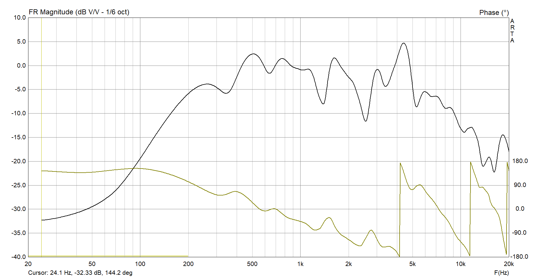 А есть возможность снять АЧХ на улице, а динамик без ничего подвесить? Или хотя-бы в большой комнате в центре тоже подвесить с 10 см, интересно просто реально так ломает диффузор после поршневого режима или это самодельный (измерительный) корпус.
