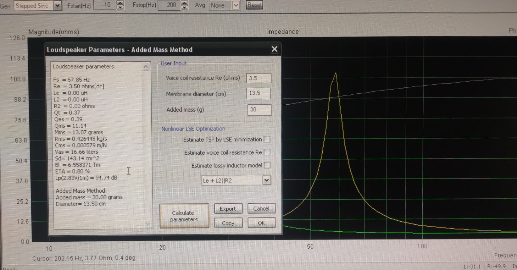 57 Гц идеальный резонанс для стабильного 8" НЧ. Как следствие - эквивалентный объем вполне хорош, не конские 70 л. Добротность тоже в полном порядке, чуть ниже идеальной для ФИ.