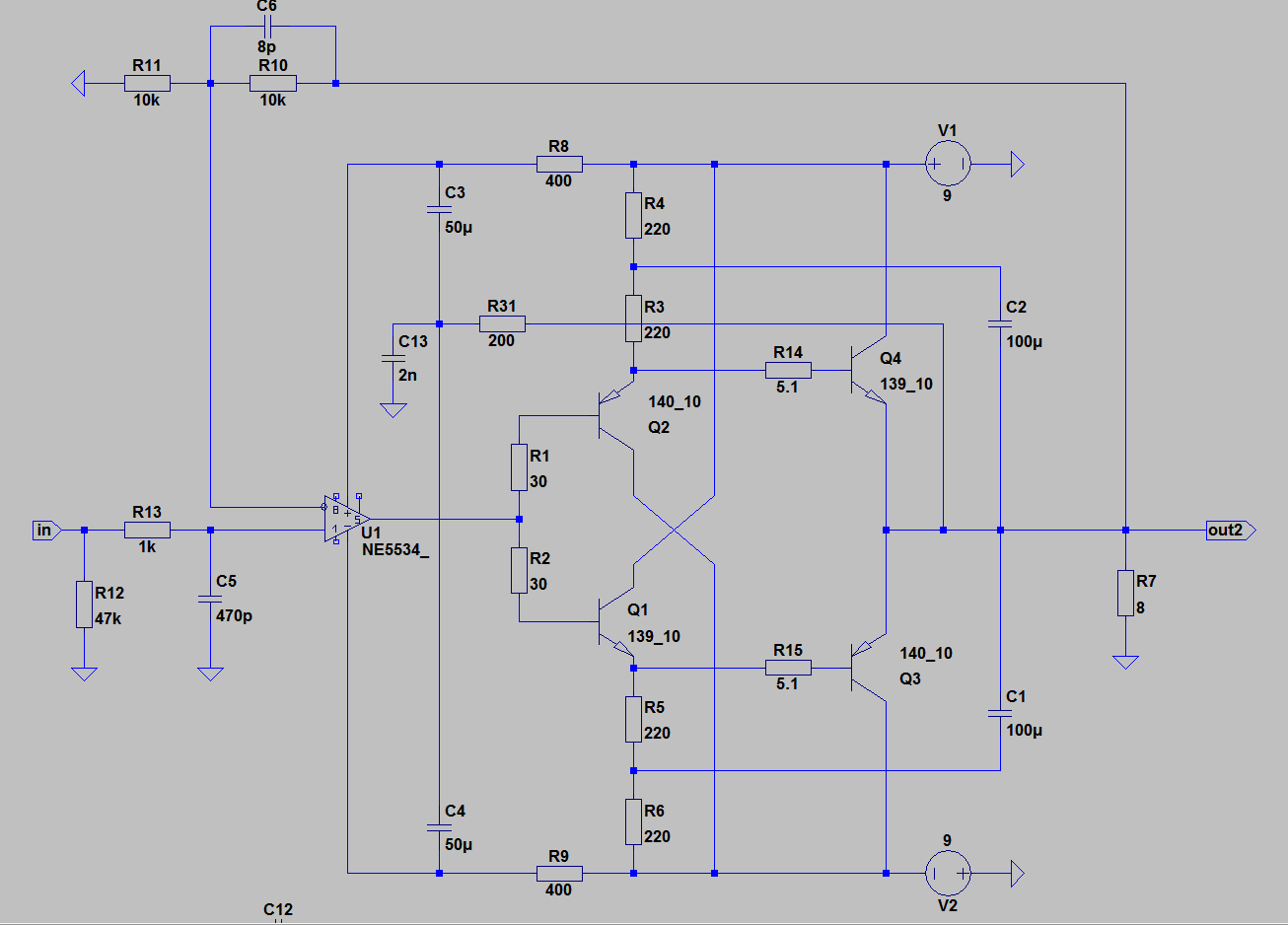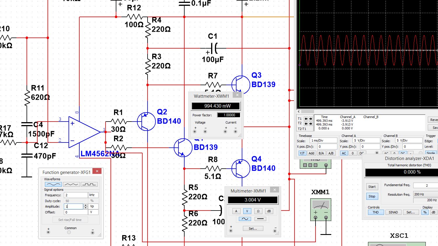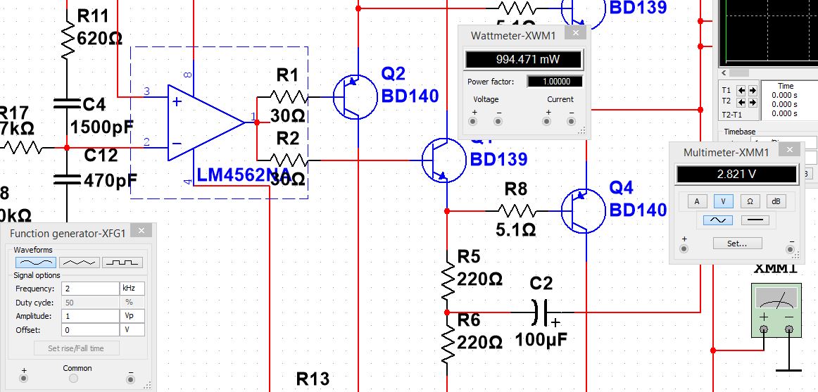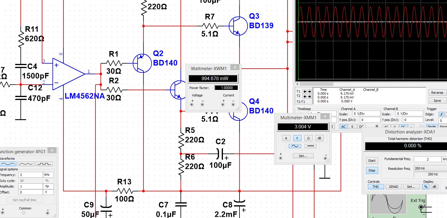 ЛМ4562 в капе нет , использовал АД845. С лм-кой лишь С3 возможно иной номинал будет. Модели транзюков от Кордеса. Модель оу полная. Ввел коррекцию.Чувствительность при номиналке 1.6вольта. Ограничение симметричное. Кг порядка 0.002% на 20кгц. Стабилитроны выполняют роль защиты от перенапряжения операционного усилителя.Ныне они весьма дороги. Есть вопрос по ВК. Рассеиваемая мощность на первой паре в 2.2 раза меньше мощности на выходной паре. Может КТ940/КТ9115 первыми использовать? Резисторы тогда по 470 ом вместо 220