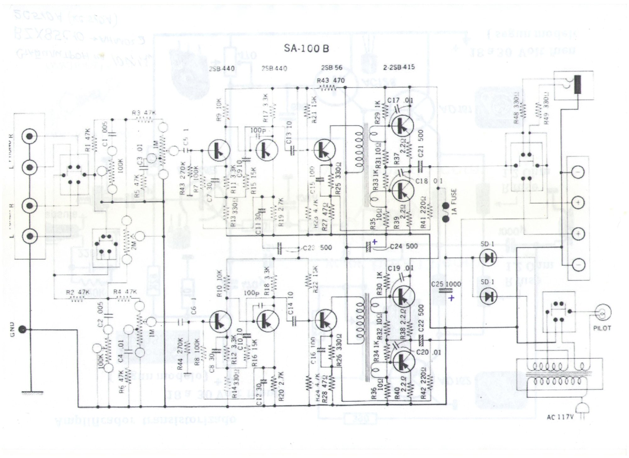 У меня ремонт,на Realistik SA-100 паспорт с ходу не нашёл но найду,но вот следующий во возрастанию по мощности из моей коллекции германиевых усилителей.Вы не смотрите,на искажения в 1%,во первых это всего тракта и вовсей полосе и на большой мощности ,во вторых он не имеет искажений высоких порядков,в третьих в то время,считалось,что если искажения 1 и менее %,то человек их не слышет и ими можно пренебреч.В четвёртых -вам нужно повторить только вых каскад на 4 транзисторах .Вых. транзисторы 2SB337 от Hitachi супер линейные.Я думаю их можно заменить 1Т906 с ещё более лучшим результатом,а в раскачку транса П605 и будет счастье.